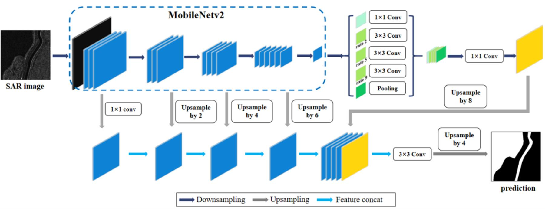 研究团队利用 “海丝一号”卫星在2021年拍摄的多景SAR洪涝灾害影像,建立了一个洪涝水体检测数据集,包含河流、水库、湖泊、水田等多种水体类型。在此基础上,团队提出了一种Modified DeepLabv3+语义分割模型(图1),实现了洪水淹没范围的快速、准确提取。