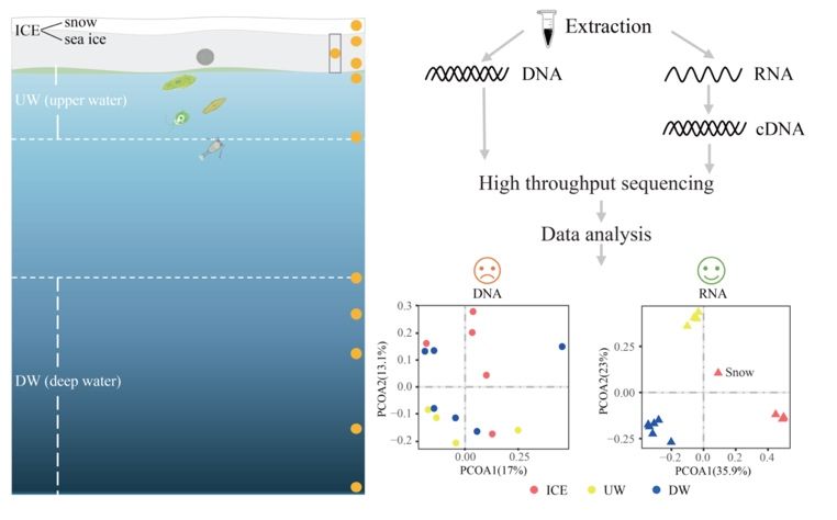 对上覆雪、冰芯及不同深度海水中原生生物的研究表明,RNA比DNA所揭示的群落对环境因子变化更为敏感,是研究特殊环境(如北极)原生生物分子多样性等更为可靠的研究手段(图1)(Kong et al., 2023. Sci. Total Environ.)。
