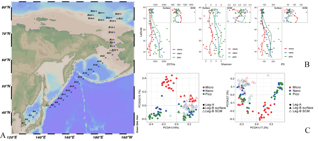 图3. 日本海-北极纬度断面采样站位(A)、不同粒径原生生物alpha多样性指数沿纬度梯度分布(B)及群落聚类(C)