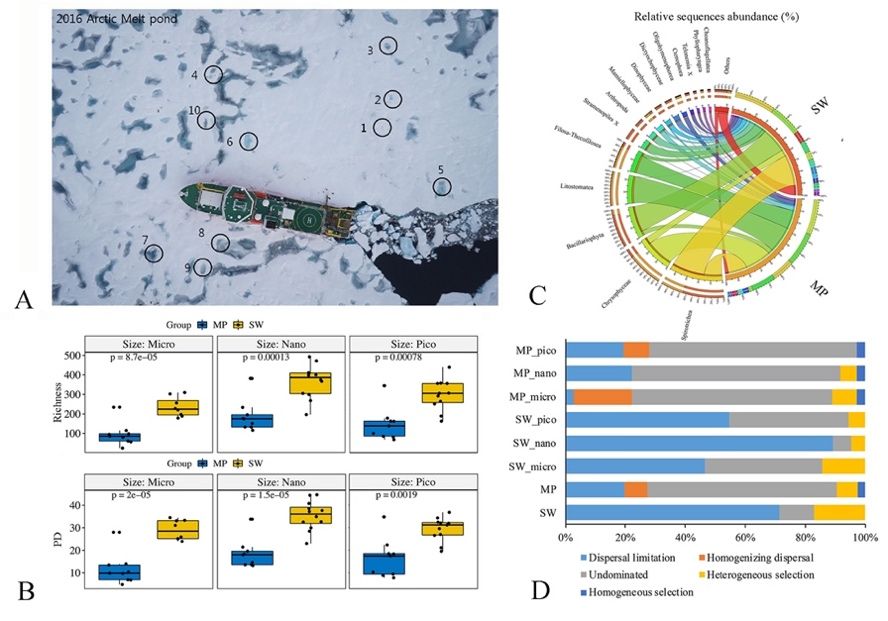 对夏季北极海水与融池中分粒径、活跃的原生生物类群进行了研究,结果发现:融池中原生生物alpha多样性指数远低于海水;融池中以混合营养型金藻及异养型侧口类纤毛虫为优势类群,海水则以混合营养型寡毛类纤毛虫为优势类群;海水中原生生物群落主要受扩散限制的影响,而融池中群落主要受漂变的影响(图4)(Xu et al., 2022. Front. Microbiol.)。