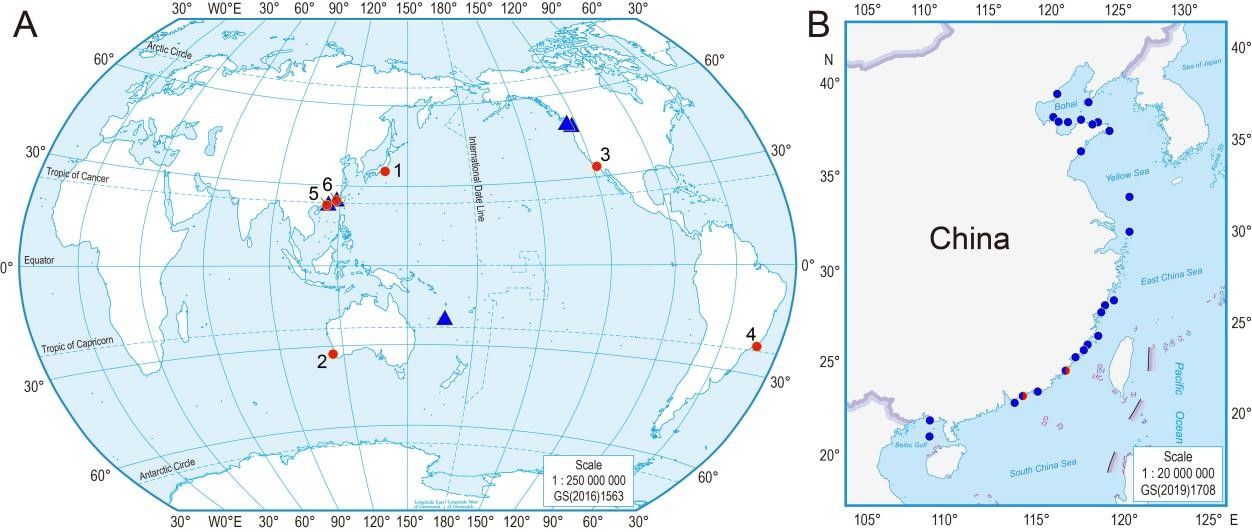 图1. 小健足虫属各代表种的模式产地(A)及该属物种在中国海域的分布记录(B)
