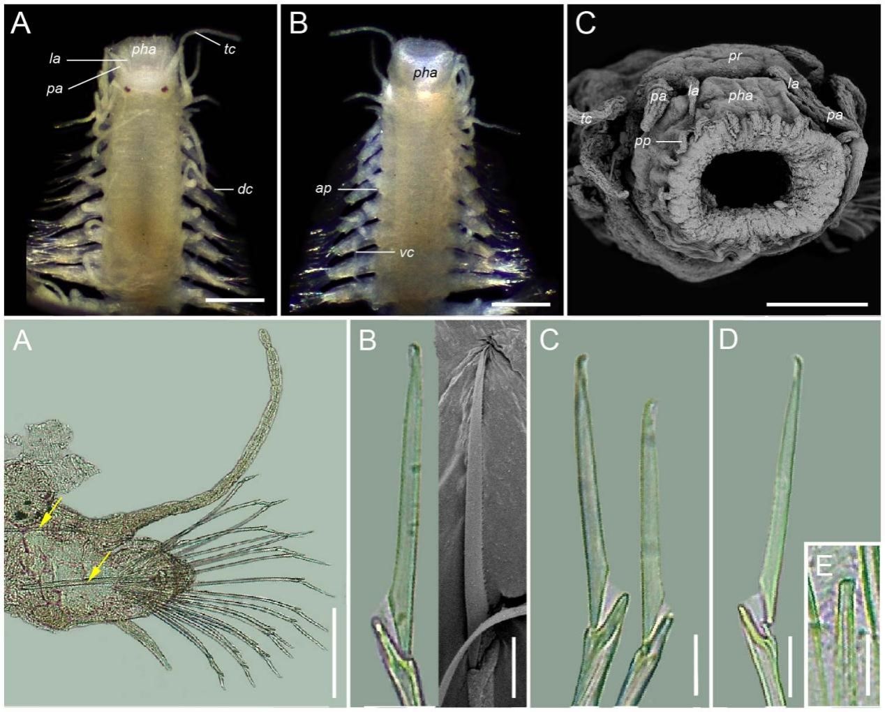 图2. 福建小健足虫的虫体(上)与疣足刚毛特征(下)