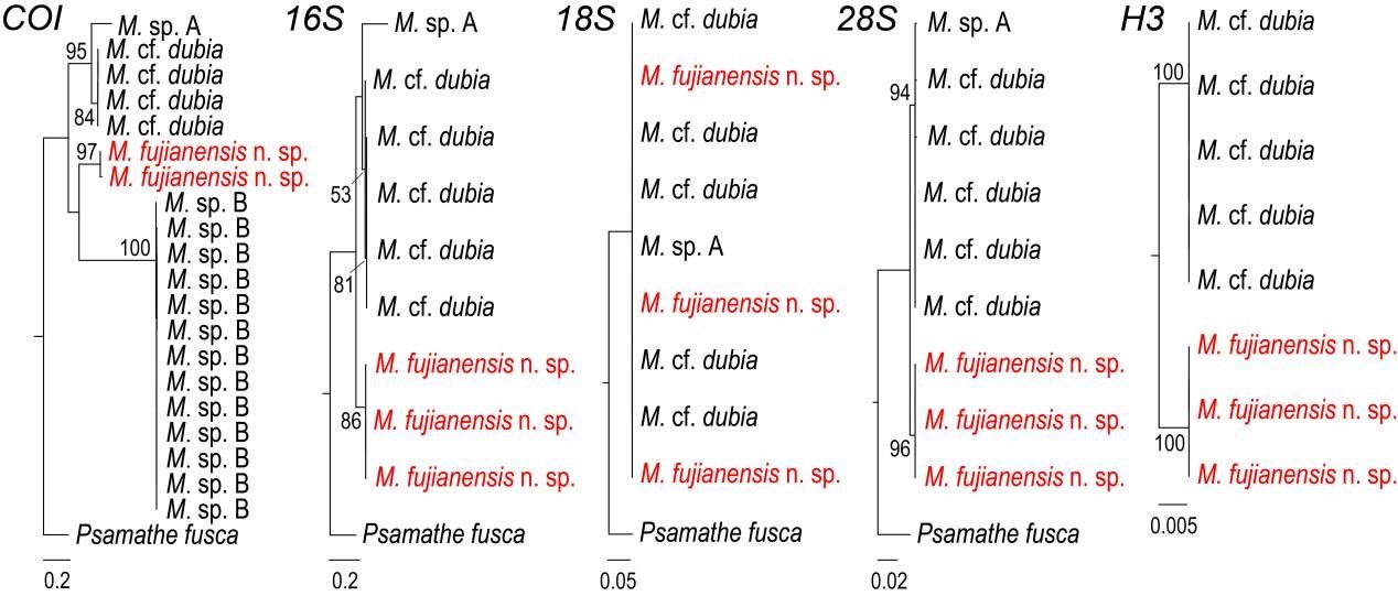 福建省东山岛周边海域具有很高的底栖生物多样性,研究人员近年来在这一海域陆续发现了多个海洋生物新物种。本文作者利用2021年在东山岛近海采集的小健足虫标本开展分类研究,结合形态学方法及分子生物学手段,发现并命名了我国东海近岸海女虫科的一个新物种——福建小健足虫Micropodarke fujianensis n. sp.,这是自1960年在中国海域首次记录小健足虫属以来报道的该属第二个有效种。该研究详细描述了新种的形态特征,并指出新种的主要特征是复型刚毛端片基部不具较长的刺。同时,研究团队根据现有分子数据,在太平洋和印度洋区域区筛选出小健足虫属的4个物种。