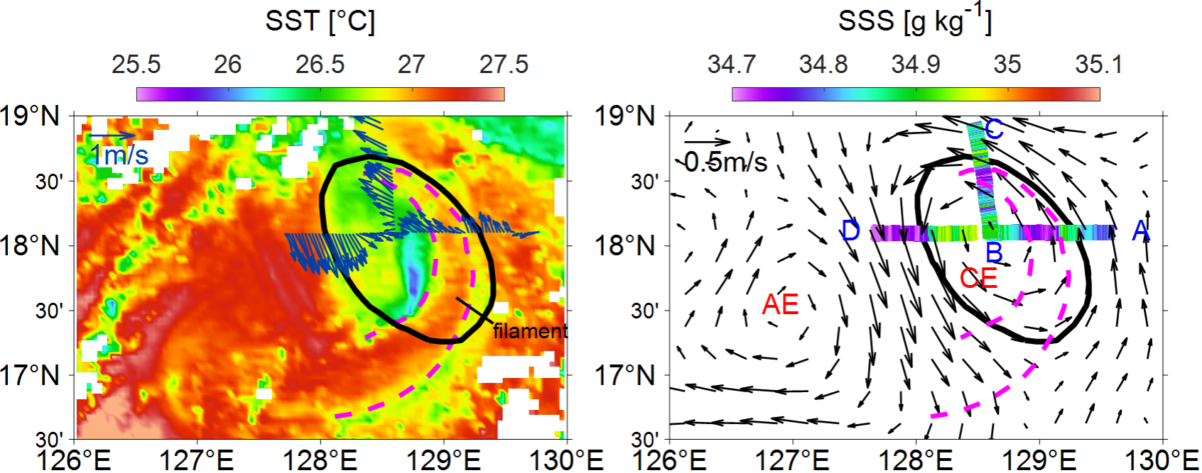 近日,物理海洋学领域权威期刊Journal of Physical Oceanography在线发表了厦门大学海洋与地球学院、近海海洋环境科学国家重点实验室刘志宇教授研究组题为“Observations of a Filamentous Intrusion and Vigorous Submesoscale Turbulence within a Cyclonic Mesoscale Eddy”的研究论文。该研究基于由厦门大学“嘉庚”号科考船所开展的中尺度涡多学科综合观测(KK1902航次),通过集成分析船基高分辨率拖曳观测资料、卫星遥感图像以及漂流浮标观测等数据,完整揭示了一个亚中尺度涡丝入侵中尺度气旋涡的动力过程与效应。该研究为深入理解中尺度涡的相干性、涡致输运机理以及中尺度涡的亚中尺度特性提供了重要的观测证据。