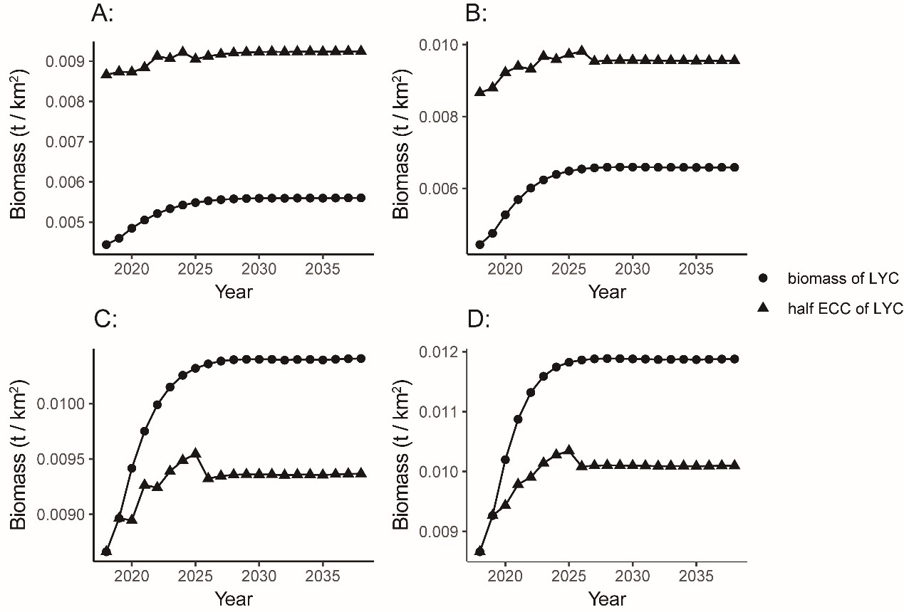 图3. 不同模拟情境下大黄鱼生物量和50%环境容纳量的变化