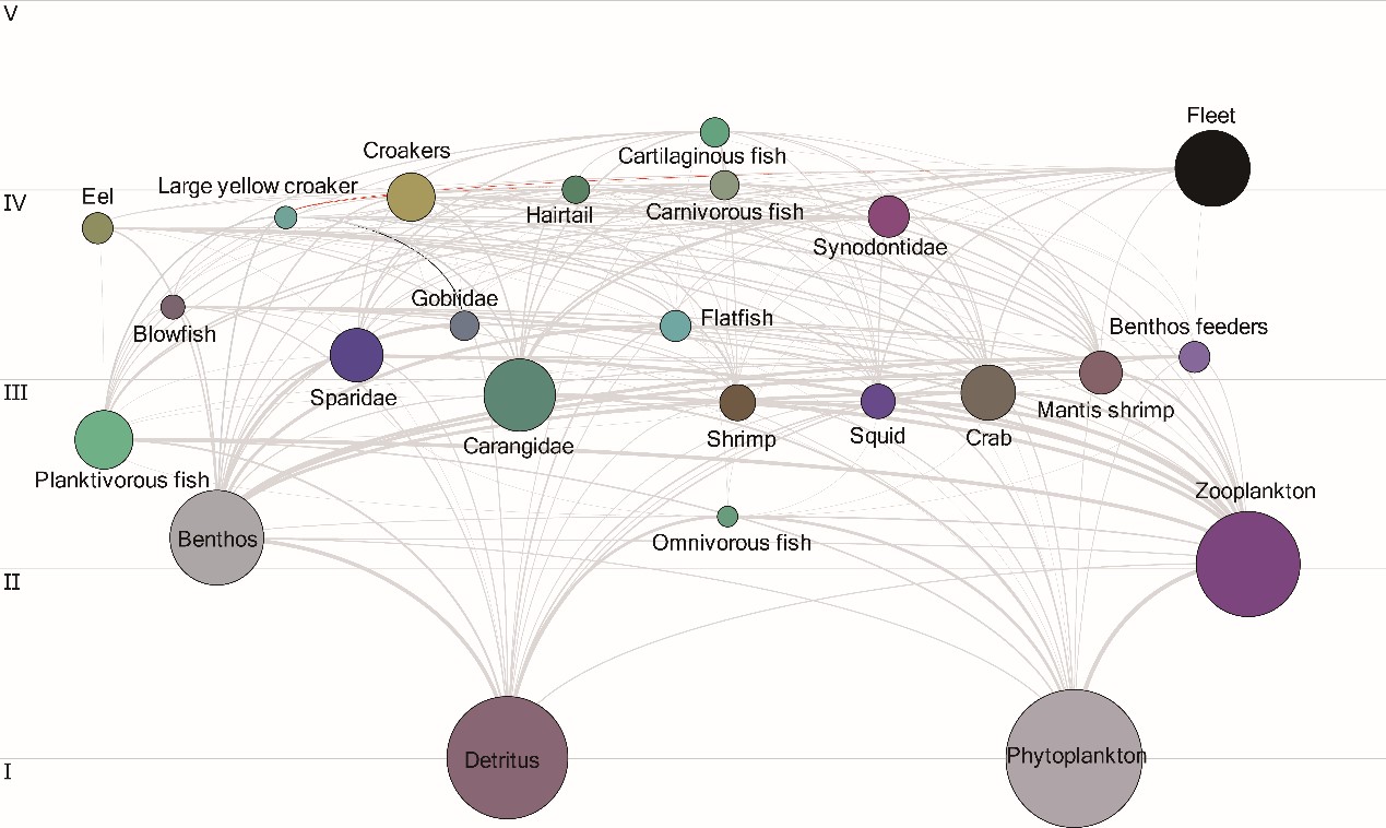 闽江口生态系统模型共设置了23个功能组,基本上涵盖了能量流动的所有过程(图2),其中大黄鱼营养级为3.860。