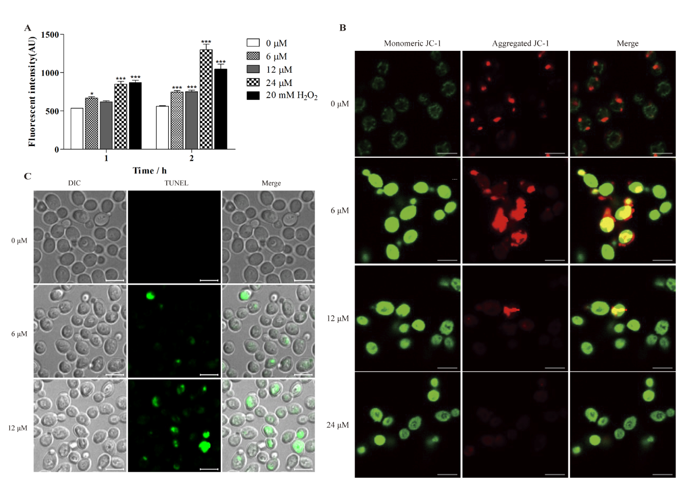 Scyampcin44-63处理后的白色念珠菌转录组分析结果表明,抗氧化和凋亡相关基因上调表达。利用DCFH-DA和JC-1探针以及TUNEL染色,证实Scyampcin44-63处理可显著升高胞内ROS水平,破坏线粒体膜电位,诱导白色念珠菌产生凋亡。