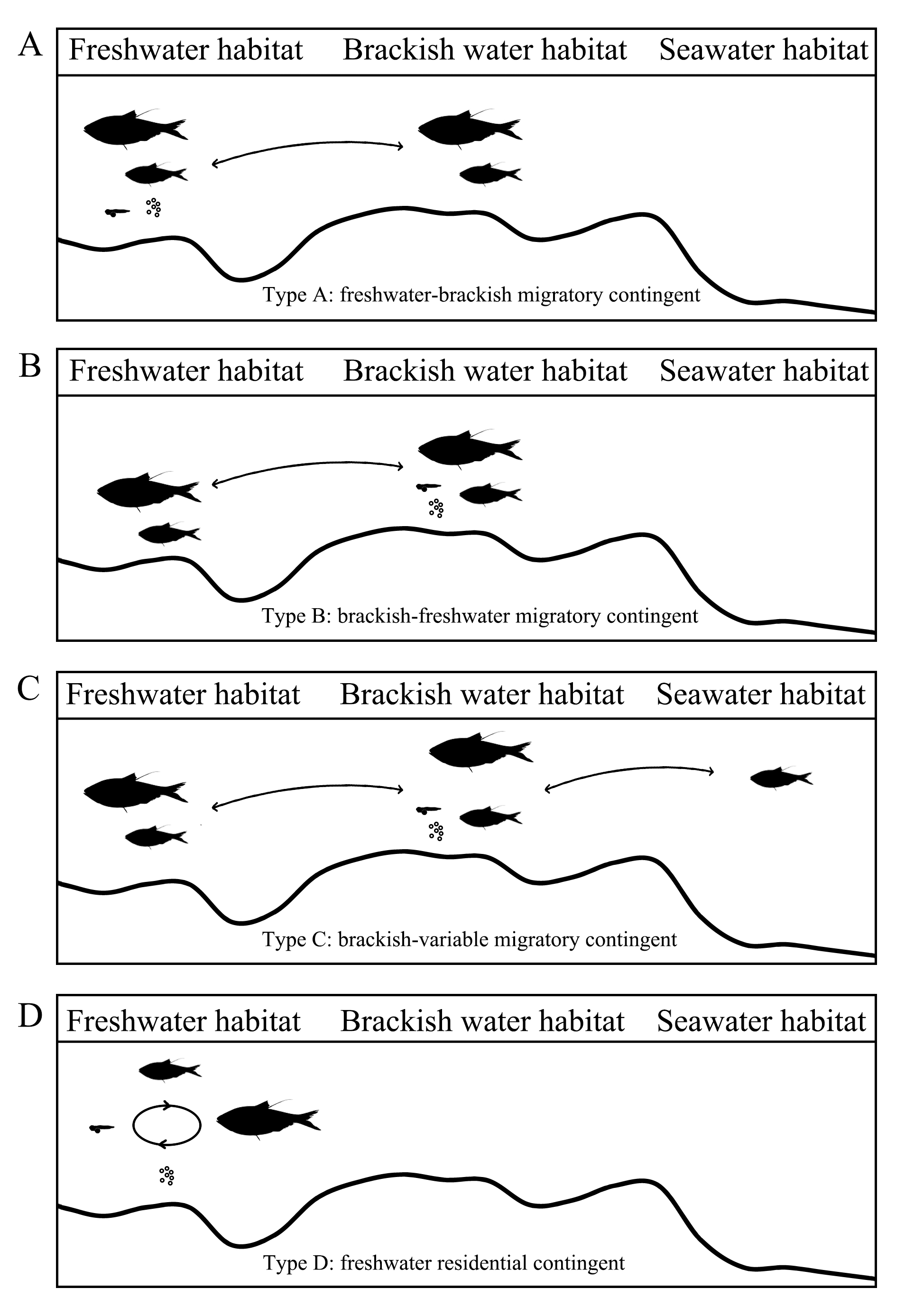 图2. 花鰶的生活史类型示意图,A-C为三个洄游类型,D为淡水定居类型