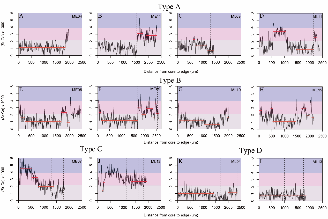 图1. 依据花鰶耳石Sr:Ca比值确认的三个洄游类型(A-C型)和一个淡水定居类型(D型)。竖直黑色虚线表示花鰶的年轮(从左至右,年龄递增);水平红色实线表示通过变化点分析确定的稳定特征;浅粉色区域表示淡水生境;粉色区域表示半咸水生境;紫色区域表示海水生境