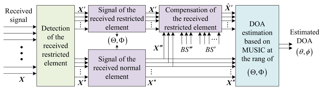 该方法首先基于傅里叶变换,将阵列接收信号转换到频域进行能量检测,以区分接收受限阵元与正常接收阵元,并根据以上不同类型阵元的空间分布特征,粗略判断目标所在方位的近似范围,降低后续处理复杂度;然后,以正常接收阵元接收到的目标信号为参考,重构接收受限阵元的接收信号,消除阴影效应,提高阵列自由度;更进一步,在目标所在方位的近似范围内,采用峰值搜索方法确定目标精确方位;最后,分析了圆柱共形阵的克拉默-拉奥(Cramér-Rao lower bound, CRLB)下界,阐明了遮蔽效应下该阵列所能达到的最佳定位精度。
