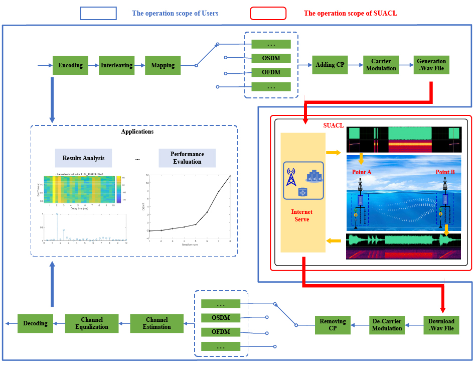 本研究依托水下物联网框架,提出了一个用于水声实验的共享水声通信层方案,用户可通过互联网远程接入该共享水声通信层的控制平台,通过配置相应的实验参数开展远程水声通信实验(图1)。与传统的海试相比,该方案可降低海上声学实验的成本和风险,为用户提供更安全快捷的远程水声数据采集方式。