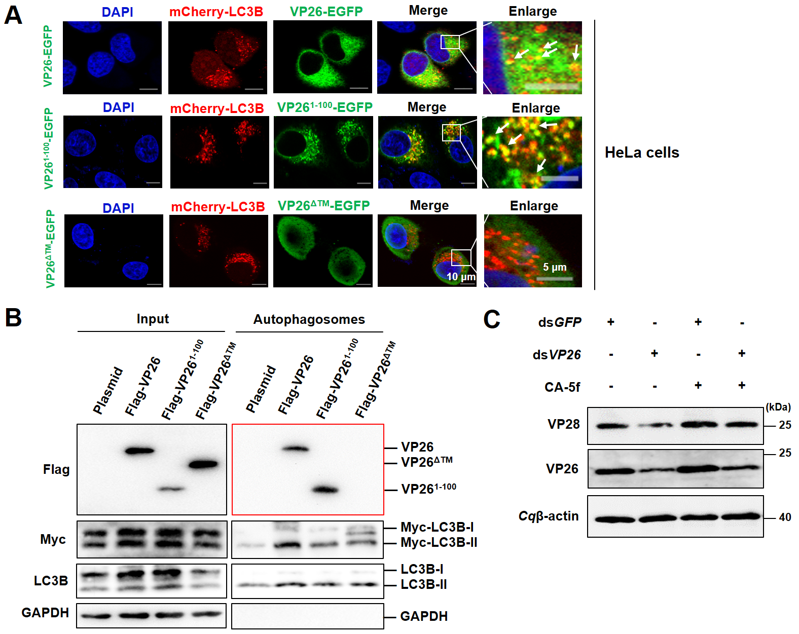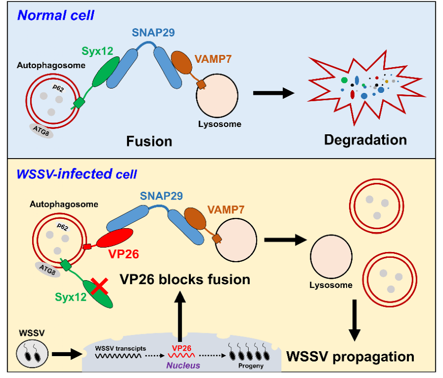 该研究首次揭示了WSSV感染后表达的病毒蛋白如何逃逸自噬-溶酶体降解这一无脊椎动物抗病毒先天免疫的关键分子机制,阐明了WSSV结构蛋白VP26通过抑制自噬-溶酶体降解在促进病毒免疫逃逸中发挥核心作用 ,为水生甲壳动物抗WSSV感染提供了新干预靶点。