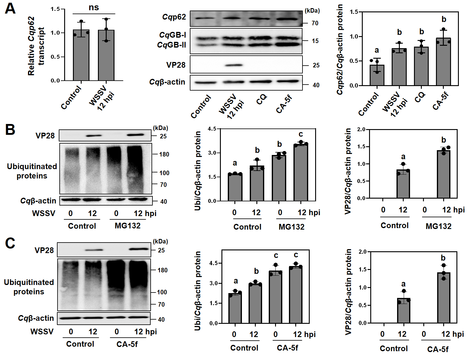 为进一步阐明WSSV感染引发的自噬体积累属于哪种类型,研究人员择取经典自噬受体标志物p62予以分析:自噬流激活会消耗p62蛋白,导致其存量降低;反之,若自噬流被抑制,则会阻滞自噬降解进而导致p62蛋白累积。实验结果表明,WSSV感染后的p62蛋白与细胞内泛素化蛋白存量均显著增加(图2),这一结果表明WSSV感染明显抑制了宿主细胞的自噬性降解。