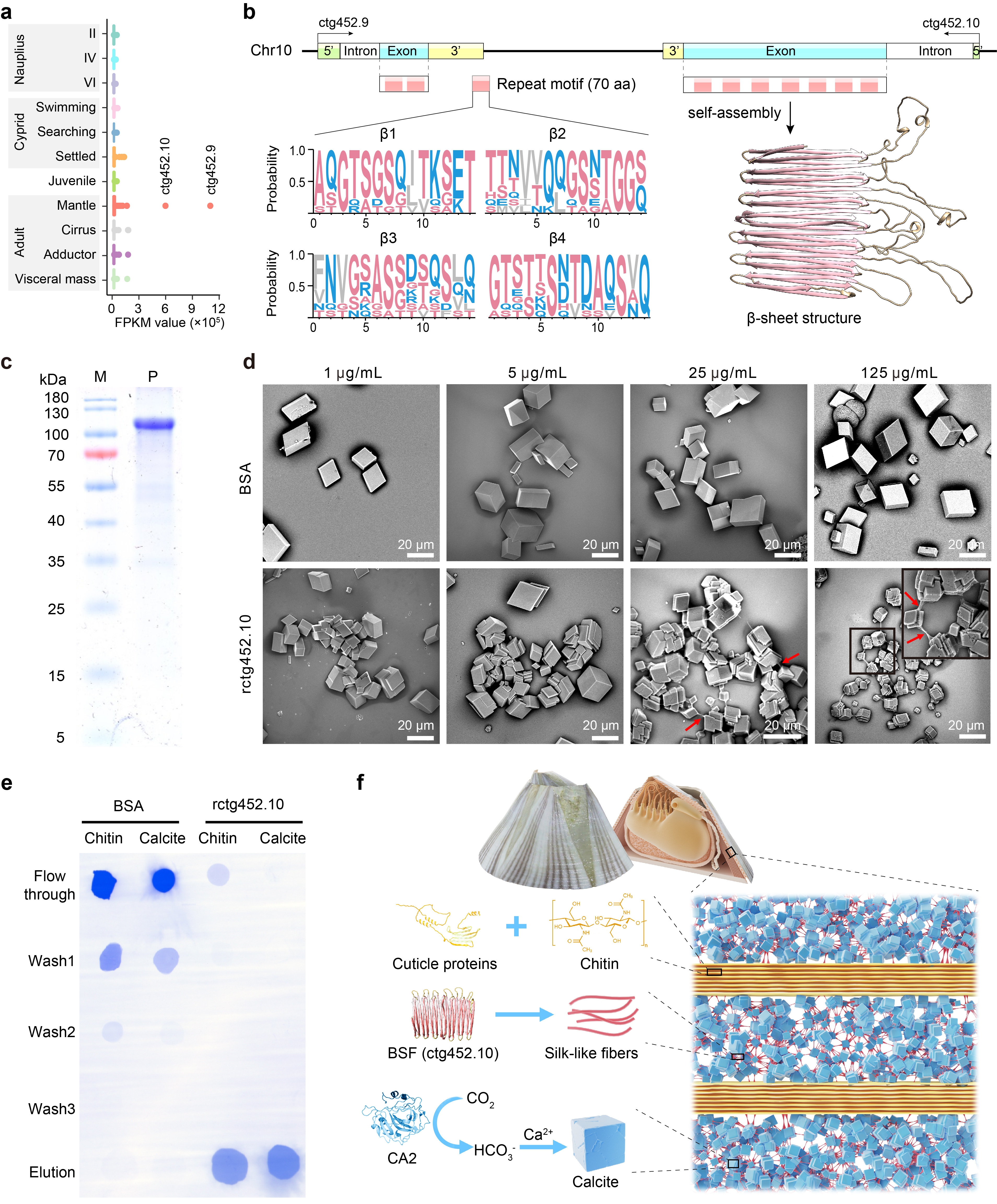 另外,该研究还发现一个在纹藤壶壳形成关键组织外套膜中超高表达的新基因(bsf,图3),其编码的蛋白包含7个重复基序,每个重复基序可形成4个反向平行的β折叠结构。其重组蛋白可在水环境中自组装形成丝状纤维,与几丁质和方解石紧密结合。该研究提出了藤壶壳形成的机制模型,即表皮蛋白通过结合几丁质形成几丁质层,碳酸酐酶通过催化形成HCO3-进而结合Ca2+形成方解石层,蛋白BSF促进方解石的凝聚矿化并黏合几丁质层,形成稳固的方解石-几丁质依次排列的层状结构。探究适应特定环境进化的bsf基因特征,有助于开发水环境中具有特殊黏合作用的仿生材料。