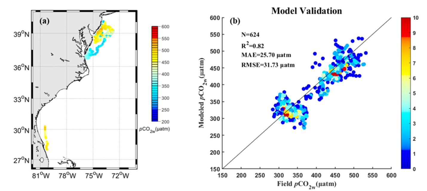 研究团队构建了一个高空间分辨率的pCO2模型(0.05°×0.05°,8天周期)测试选择最佳反演方法和输入变量,并利用该模型进行pCO2的反演和分析。之后作者使用2015-2020年的数据训练回归模型比较了20种算法反演pCO2。结果表明,当模型采用一种名为Cubist的机器学习算法,并使用SST、SSS和Chl-a作为输入变量时,模型的表现最好(均方根误差(RMSE)为21.75 μatm,决定系数R2为0.88)。该模型精度在增加海表粗糙度这一新的输入变量后显著提高,R2提升至0.95,RMSE降至14.79 μatm。如图1所示,彩色标注的数据密度图示直观显示在每个6.5微大气压(µatm)的pCO2区间内的数据点密度。该结果反映了海表粗糙度作为模型输入变量的重要性。研究团队进一步使用2021年收集的独立观测pCO2数据进行测试,得到R2为0.82,RMSE为31.73 μatm,验证了该模型的可靠性。
