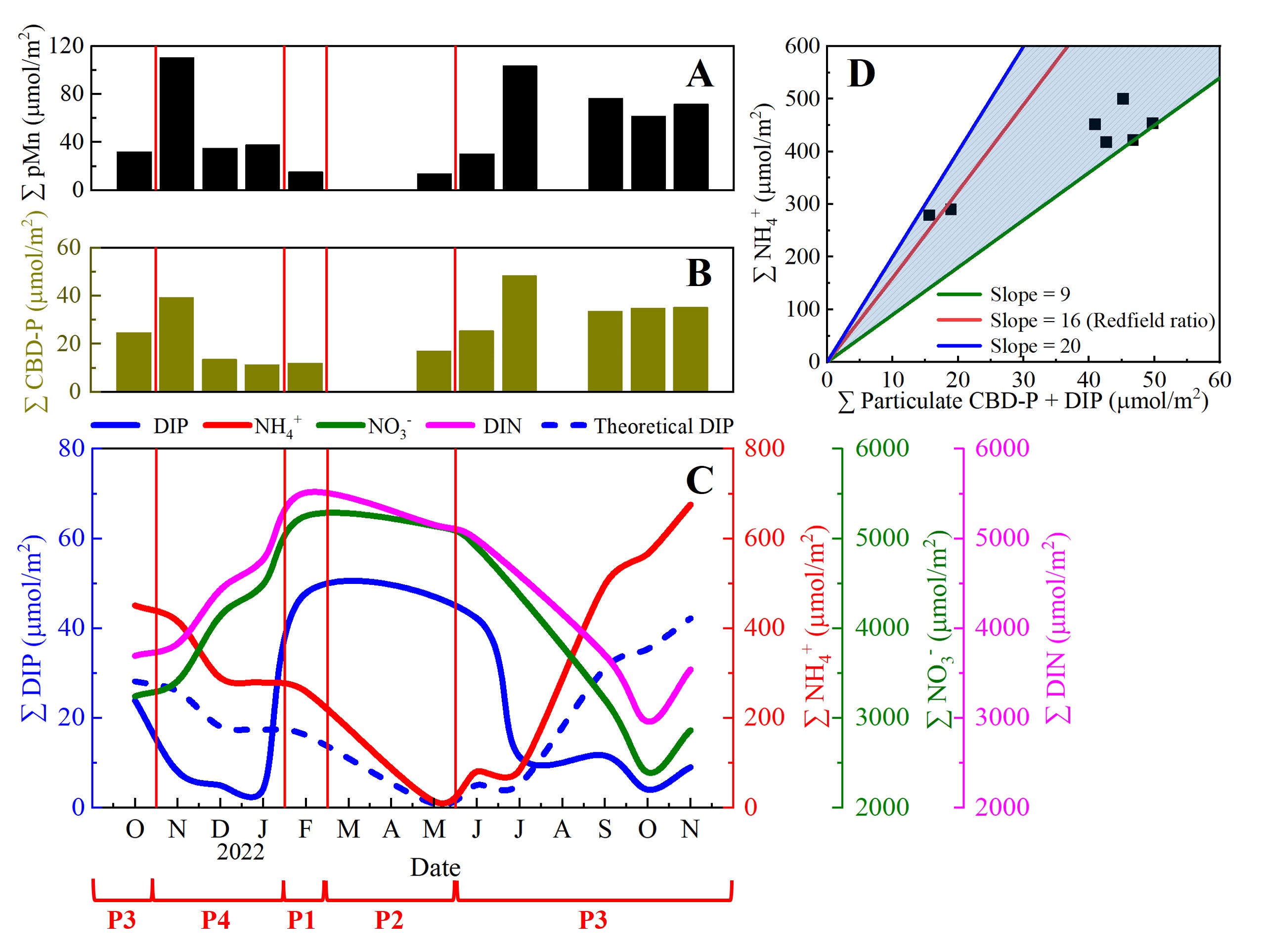 图3 深水区(10-40米)中Mn(A)、铁锰结合态磷(CBD-P)(B)以及NH4+、NO3-、DIN和DIP(C)的水柱积分;在P3和P4时期,深水区中DIP的水柱积分与CBD-P+NH4+的水柱积分的散点图(D)。在(A)、(B)和(C)中,红实线表示不同时期的边界。在(C)中,蓝色虚线表示基于Redfield化学计量比计算的理论DIP的水柱积分。X轴上的红色括号表示水库的不同时期:混合期(P1)、层化建立期(P2)、稳定层化期(P3)和层化破坏期(P4)