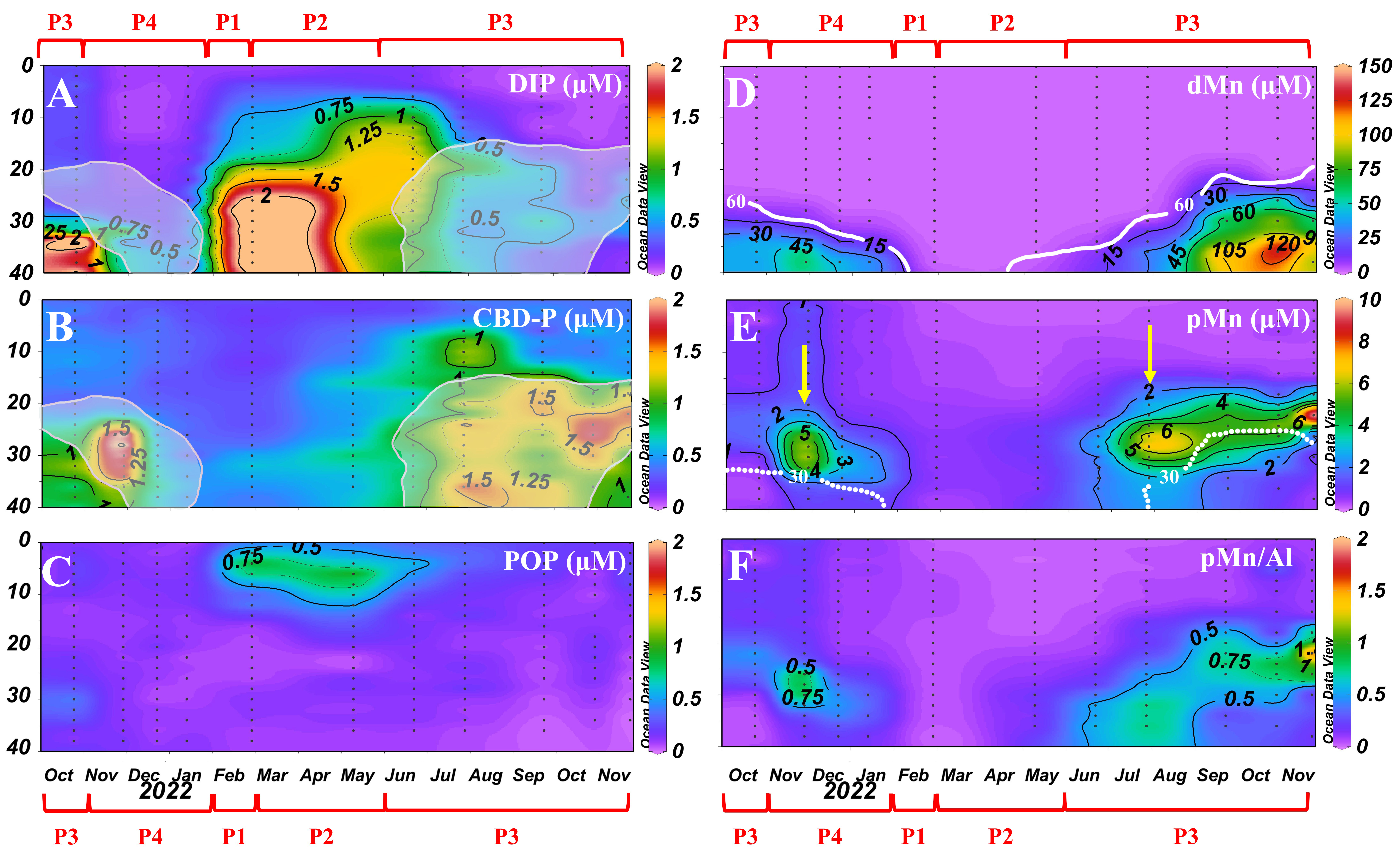 图4不同形态的P和Mn的时空变化图。其中,黑色圆点代表采样点。(A)和(B)区域的灰色阴影表示锰氧化物区,定义为颗粒锰浓度超过1.5 μmol/L的区域。(D)中的白色实线代表DO为60 μmol/L和6 μmol/L的等值线;而(E)中的白色虚线代表dMn为30 μmol/L的等值线。(E)中的黄色箭头表示pMn峰值出现的时期。X轴上的红色括号表示水库的不同时期:混合期(P1)、层化建立期(P2)、稳定层化期(P3)和层化破坏期(P4)