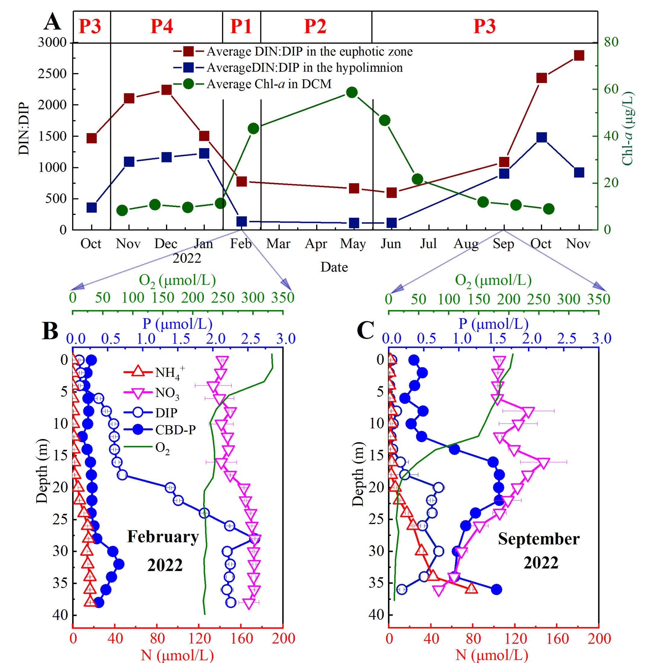 图1溶解无机氮和溶解无机磷的化学计量比以及平均叶绿素a浓度的月度变化趋势(A); 2022年2月(B)和2022年9月(C)的不同形态氮、磷的剖面数据。在图(A)中,P1-P4表示水库的不同时期:混合期(P1)、层化建立期(P2)、稳定层化期(P3)和层化破坏期(P4)