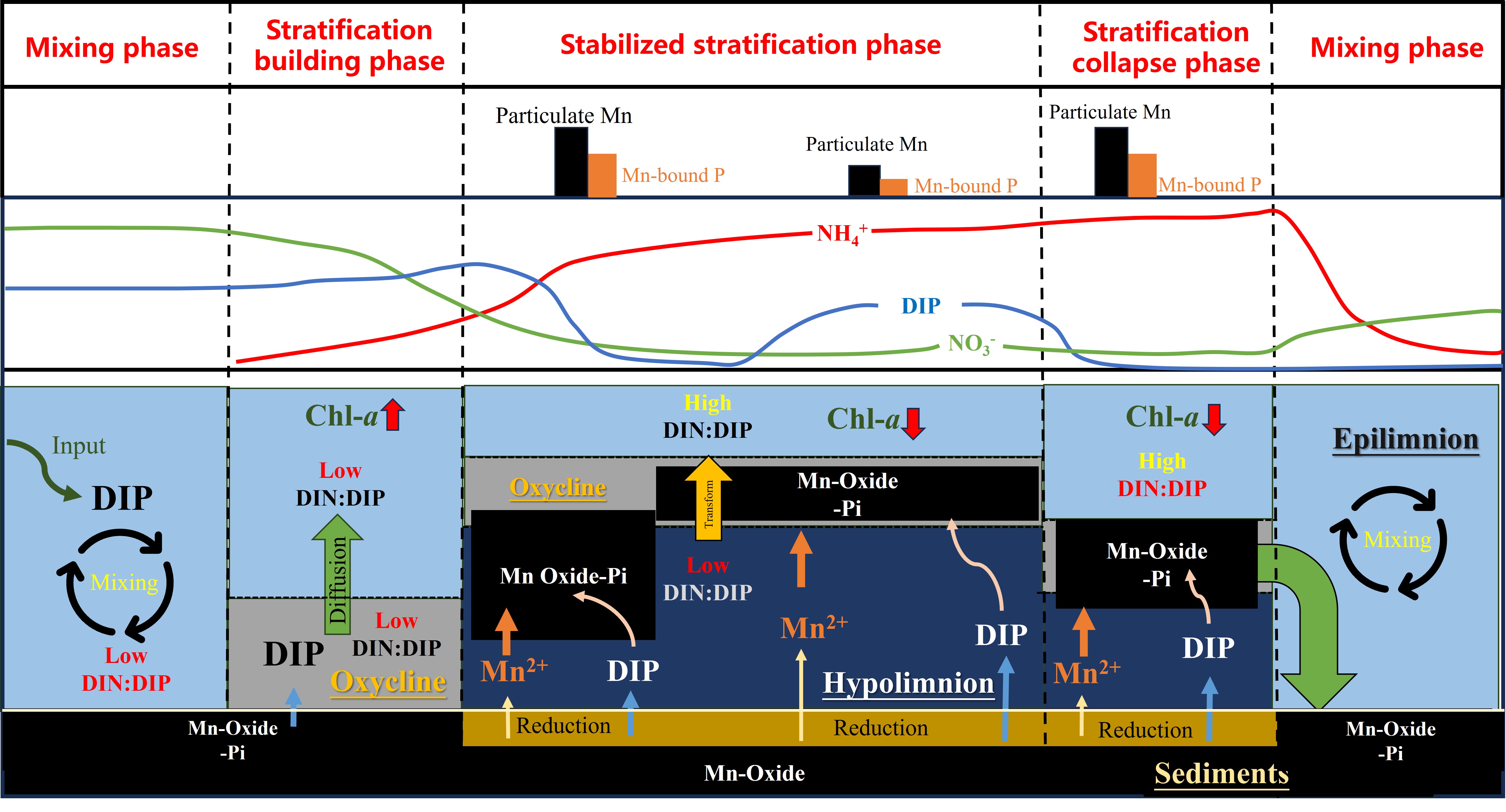 人类活动导致营养盐在湖库沉积物中大量积累,而微生物矿化过程将营养盐逐渐释放至上覆水,造成水体营养盐浓度上升,诱发藻华爆发,是全球湖库生态系统一个备受关注的环境问题。磷是淡水生态系统的主要限制因子,因此磷从沉积物向上覆水体地释放可能会引起严重的生态风险。与此同时,锰是自然界中一种广泛分布的氧化还原敏感元素,其氧化物对磷有着巨大的吸附能力。然而,迄今为止,锰元素在湖库系统中的迁移转化及其对磷循环的影响尚未得到充分地理解。