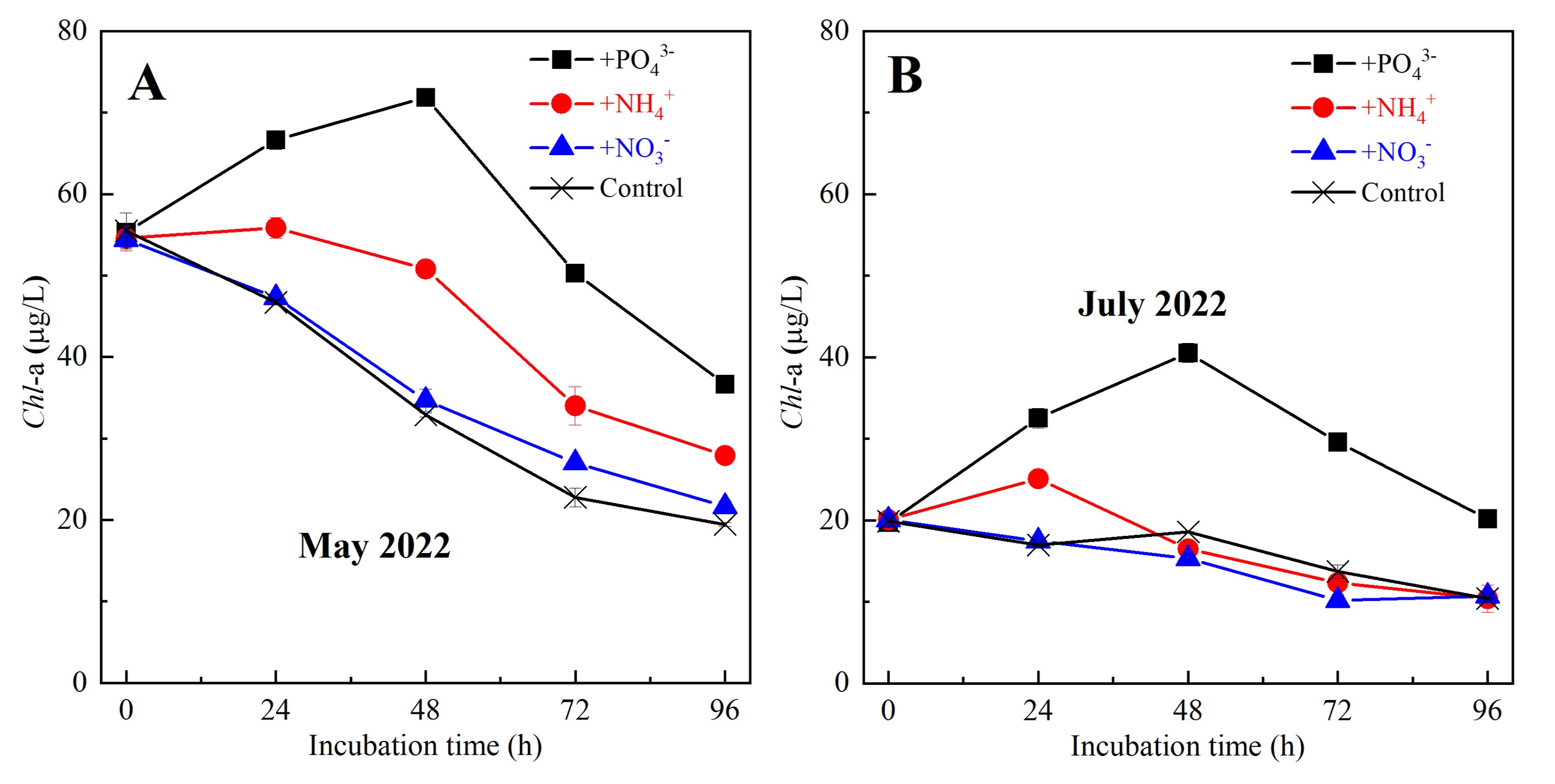 图2营养盐添加实验中叶绿素 a 浓度随时间变化趋势(A:2022年5月,B:2022年7月)