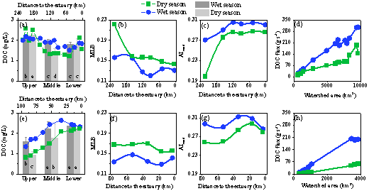 研究团队选取土地利用格局差别明显的九龙江两条支流(北溪:上游城市化扰动较强,中游梯级水库影响;西溪:农业活动主导,下游叠加城市化)作为典型研究区域,调查了干、湿季两条河流连续体中DOM光学性质、分子组成及通量的时空变化模式。研究发现,北溪溶解有机碳(DOC)浓度及生物活性分子数量沿连续体呈逐渐下降趋势,而芳香指数则逐渐增加(图1),表明上游人为源DOM在长传输距离及中游梯级水库影响下,经微生物转化而变得更加惰性。同时,沿北溪连续体DOC通量增幅仅为水通量增幅的76.7-91.8%,表明微生物降解或中游低DOC产率的森林源有机质的输入稀释了DOC的通量增幅。西溪DOC浓度沿连续体逐渐增加,而生物活性分子数量和芳香指数并无明显变化,同时DOC通量增幅为水通量增幅的1.73-2.75倍,表明西溪中下游人为源DOM能够较为完整地向海洋输出。