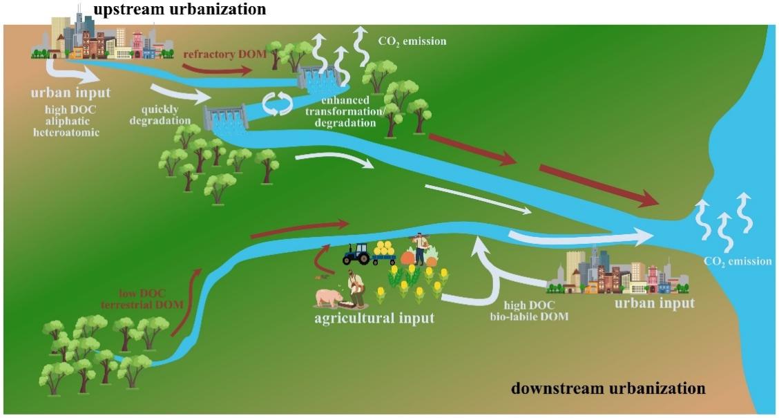 过去60年间,全球超过30%的土地覆盖因人类活动而发生改变,显著影响了河流DOM的化学多样性和生态功能。由于土地利用的流域分布模式具有分散性和空间异质性,可能导致人为源DOM在河流传输过程中经历不同的生物地球化学转化,最终影响到河流入海DOM的组成和通量。因此,研究流域土地利用空间格局对河流DOM传输与转化过程的调控机制具有重要意义。