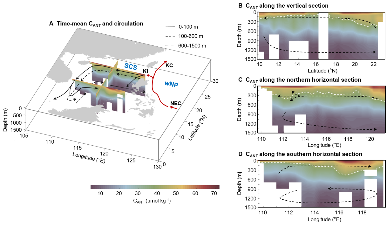 人为CO2是指工业革命以来,由人类活动排放至大气中的CO2。海洋作为地表最大的碳储库,每年吸收约25%的人为CO2,有效缓解了气候变化;但大量吸收的CO2导致海洋酸化,危害了珊瑚礁等钙化生物的生长乃至海洋生态系统的结构功能。陆架边缘海的面积仅占全球海洋总面积的7%,其人为CO2的累积速率却比开阔大洋更快,因此,传统观点认为,边缘海正在向开阔大洋输运人为CO2。然而,边缘海和开阔大洋之间的水体交换往往是三维动态的,存在显著的时间和区域变异性,这为研究边缘海人为CO2的来源、变化和效应带来了严峻挑战。南海是典型的大洋主控型边缘海,与西北太平洋之间的水体交换具有独特的“三层”环流结构,因此是解析上述问题的典型区域。