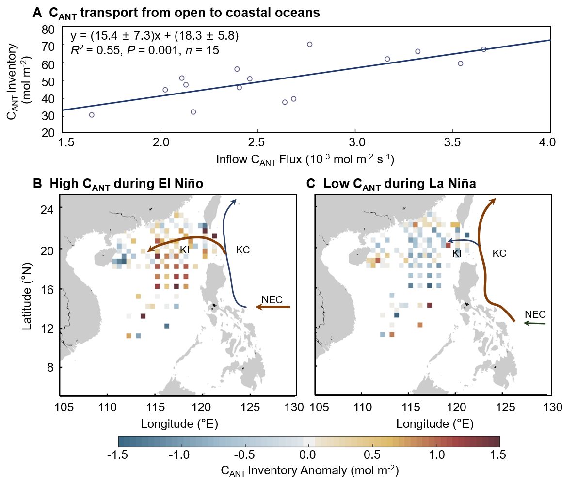 图2 ENSO调控的黑潮入侵强度变化主导南海人为CO2储量的年际变化,表现为厄尔尼诺期间的正异常和拉尼娜期间的负异常