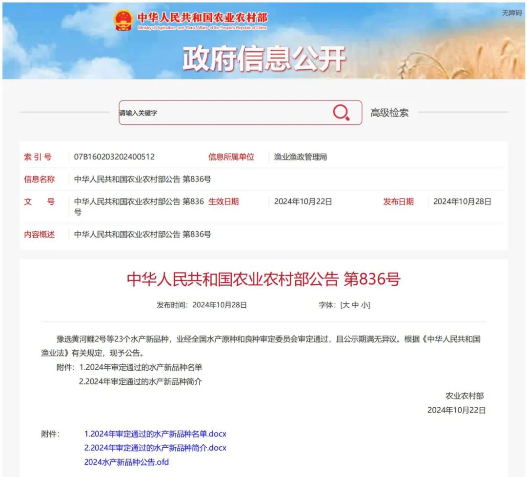 10月28日,农业农村部印发《中华人民共和国农业农村部公告第836号》,公布了23个经全国水产原种和良种审定委员会审定通过的水产新品种。由厦门大学作为第一依托高校的海水养殖生物育种全国重点实验室新增2个国审水产新品种,包括厦门大学海洋与地球学院柯才焕教授团队牵头选育的皱纹盘鲍“福海1号”(水产新品种登记号GS-01-013-2024),以及徐鹏教授团队作为第二完成单位参与选育的豫选黄河鲤2号(水产新品种登记号为GS-01-001-2024)。