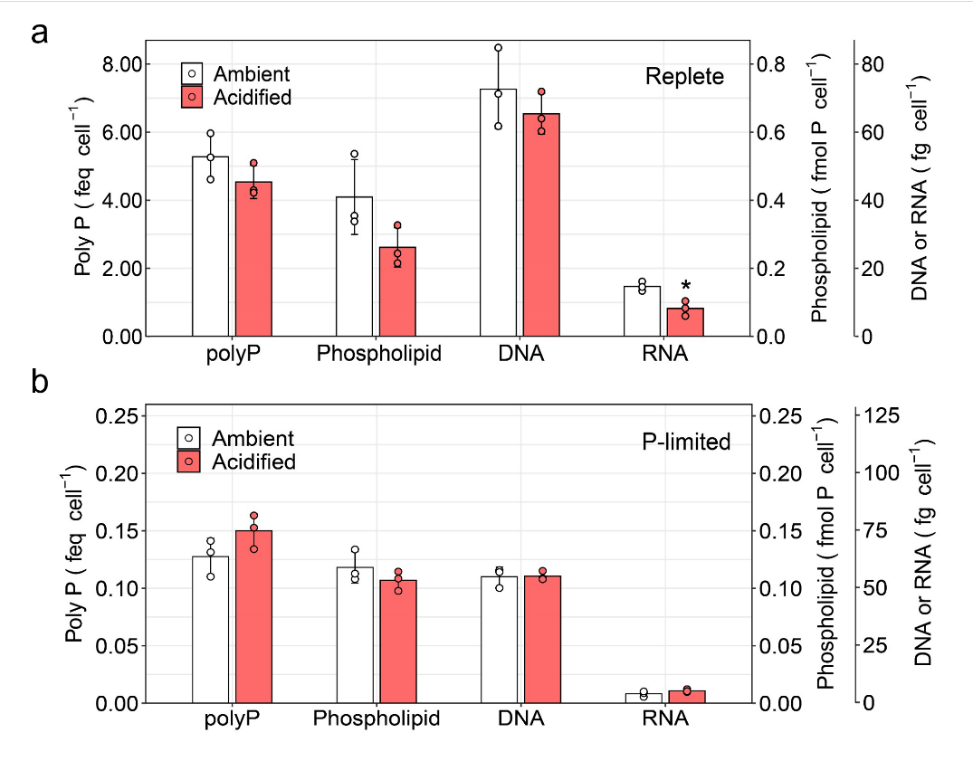 在磷限制条件下,研究团队采用chemostat连续培养技术模拟海洋中稳态的磷限制环境,发现酸化对鳄球藻的生长和固氮无显著影响(图1),这与束毛藻的结果截然不同。相较于束毛藻,鳄球藻在磷限制下胞内的多聚磷酸盐(polyP)含量极低,表明polyP更可能作为储磷物质,而非用于维持细胞内pH稳态。因此,酸化下胞内polyP含量无明显变化(图3)。然而,酸化显著降低了鳄球藻的细胞体积(图1b),使得细胞比表面积增加从而有助于提高营养盐吸收能力,可在一定程度上缓解酸化的负效应。