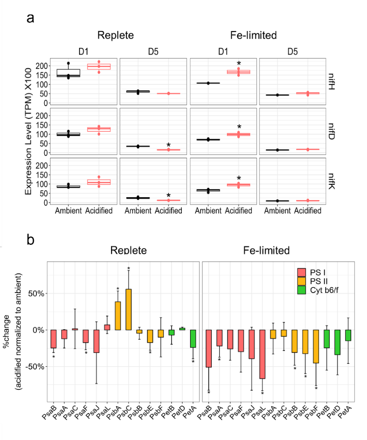 以单细胞固氮蓝藻鳄球藻Crocosphaera watsonii WH8501为研究对象,通过在不同营养盐水平(营养盐充分、铁限制和磷限制)和CO2浓度(400 vs 750 μatm)条件下开展的受控培养实验,研究团队发现海洋酸化显著抑制了鳄球藻的生长和固氮速率,并且在铁限制条件下海洋酸化的负面影响更为显著(图1)。转录组分析表明,在铁限制条件下,酸化导致细胞转移了参与光合作用、呼吸作用和叶绿素合成等关键代谢途径的铁,用于增加固氮酶的合成以弥补固氮效率的下降。这一策略虽有助于维持固氮作用,但影响了细胞能量产生,进而加剧了酸化的抑制效应(图2)。此外,在相同铁限制程度下,酸化对鳄球藻固氮的负效应要显著低于束毛藻,表明鳄球藻可能通过其高效的铁循环利用策略降低了酸化的负面影响。