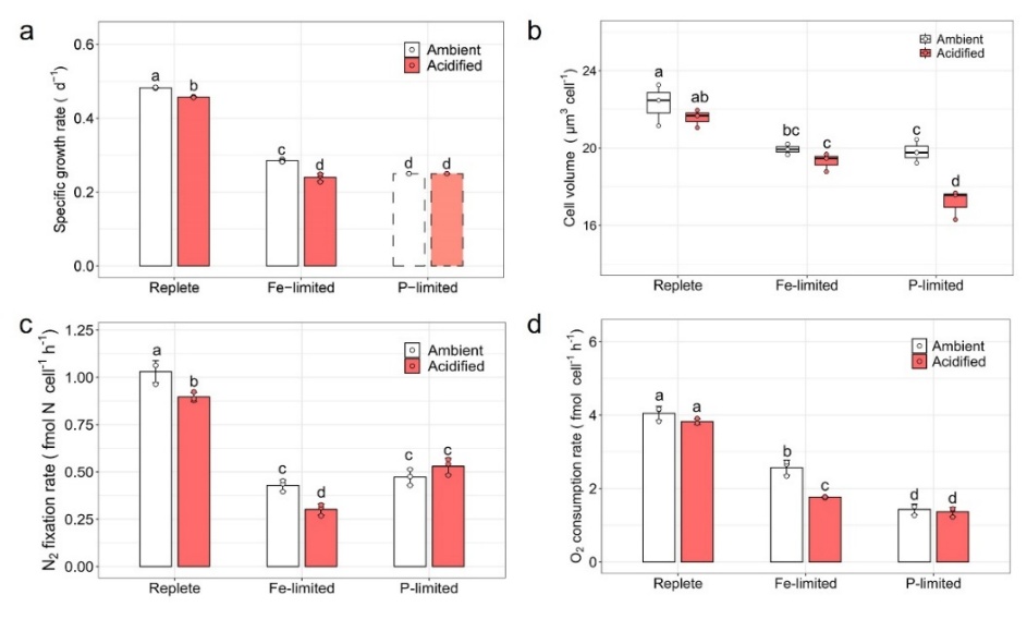 综上,本研究揭示了鳄球藻在铁和磷限制条件下对海洋酸化的响应机制,表明在未来海洋中鳄球藻和束毛藻对海水酸化和限制性营养盐条件改变的响应差异,可能会引起固氮生物群落结构的改变。该研究的主要发现有助于提升对全球变化下海洋生产力和碳、氮生物地球化学循环变化的认知。