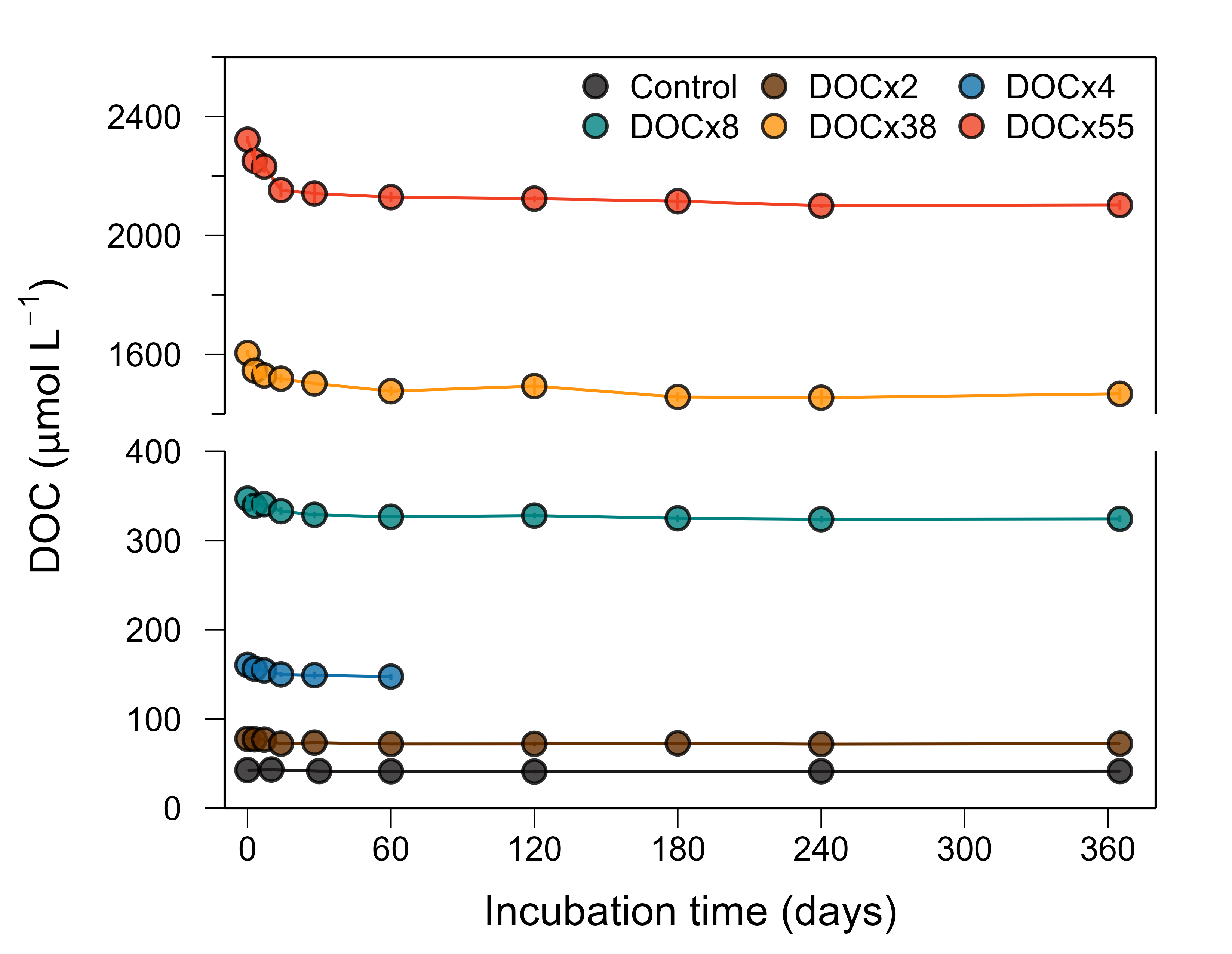 为厘清DOC生物可利用性的限度问题,研究团队将培养过程分为两个阶段:前期(0-28天)和中后期(28-365天),发现绝大部分的DOC降解发生在前期阶段,伴随着较高的DOC降解速率(最高6.0 μmol C L-1 d-1)和较快的微生物生长速率(最高2.0 d-1)(图3a和c);而在培养中后期,仅有少量(0-2%)DOC发生降解,且微生物的生长速率趋近于0 d-1(图3b和d)。该差异表明,当DOC发生累积时,仅一小部分在短期内降解,剩余绝大部分将在长时间尺度上抵抗微生物降解。