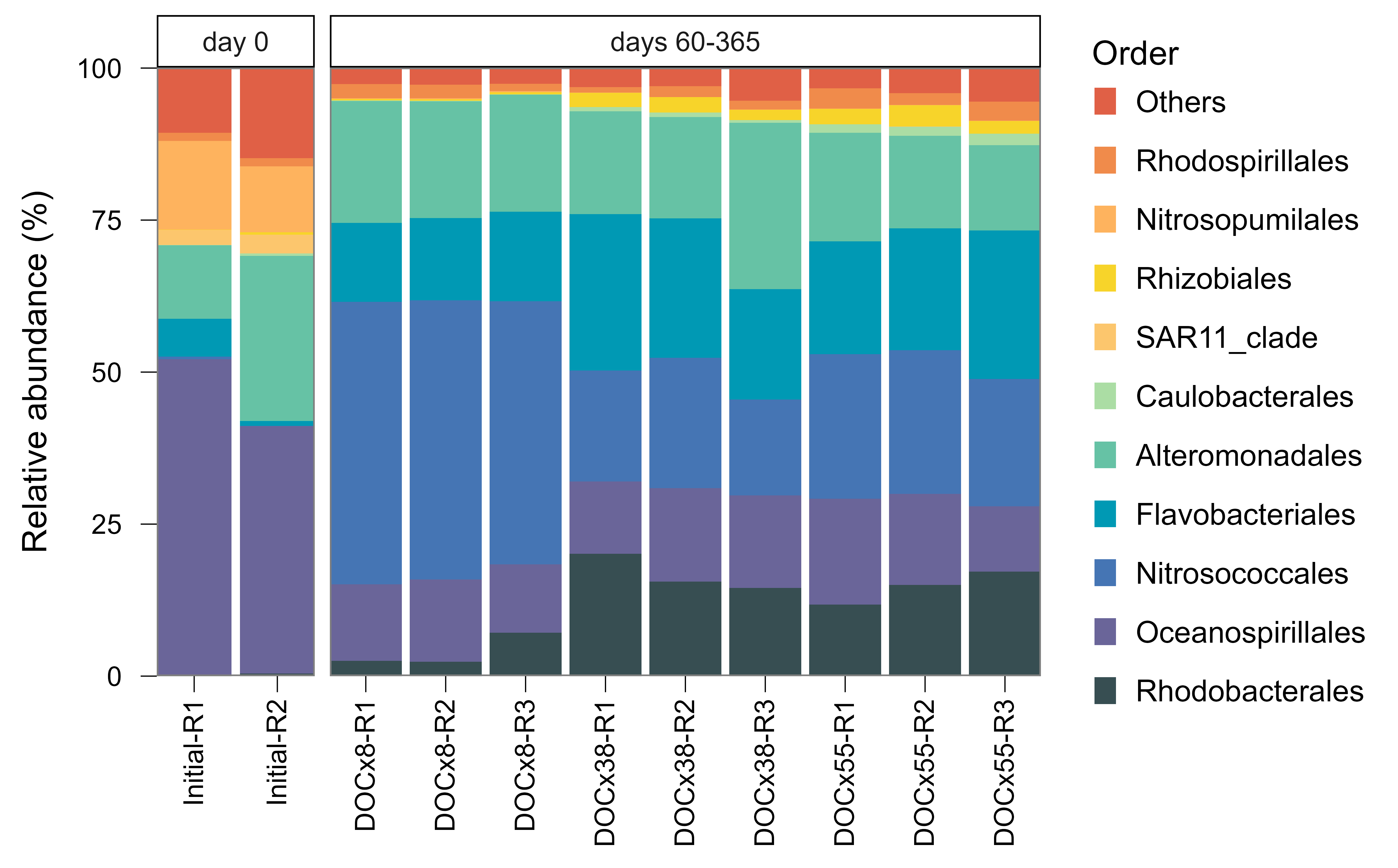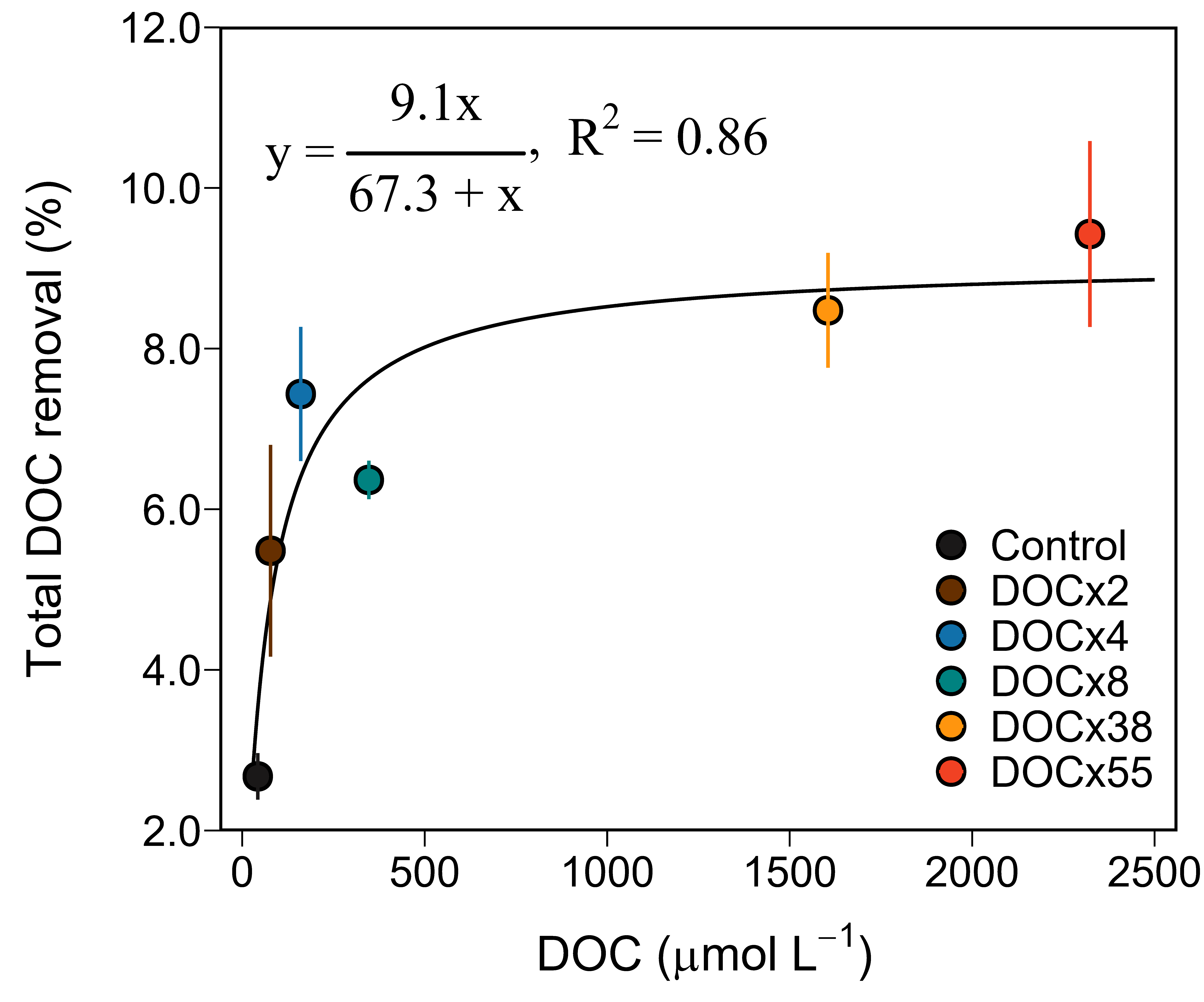 对不同浓度梯度下的DOC微生物可利用性(降解程度;%)进行定量分析,发现DOC的微生物可利用性与其初始浓度之间存在非线性关系(图2)。在低浓度下(富集1-8倍),DOC的微生物可利用性随初始DOC浓度的增加而增加(Pearson’s r = 0.6, p < 0.05);而在高浓度时(富集38和55倍),DOC的微生物可利用性达到极大值,且各实验组间无显著性差异(Mann-Whitney U test, p > 0.1)。这一非线性关系符合经典的米氏方程模型,该模型预测DOC的微生物可利用性最大值约为9.1%(图2)。