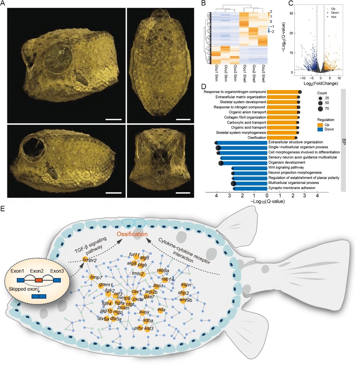 粒突箱鲀骨板和尾部皮肤的比较转录组分析揭示了与骨板形成相关的多个候选基因和通路,如postn、scpp1以及TGF-β信号通路。此外,一个eda氨基酸突变及其蛋白质结构预测结果可能指示硬骨鱼骨板的趋同进化。