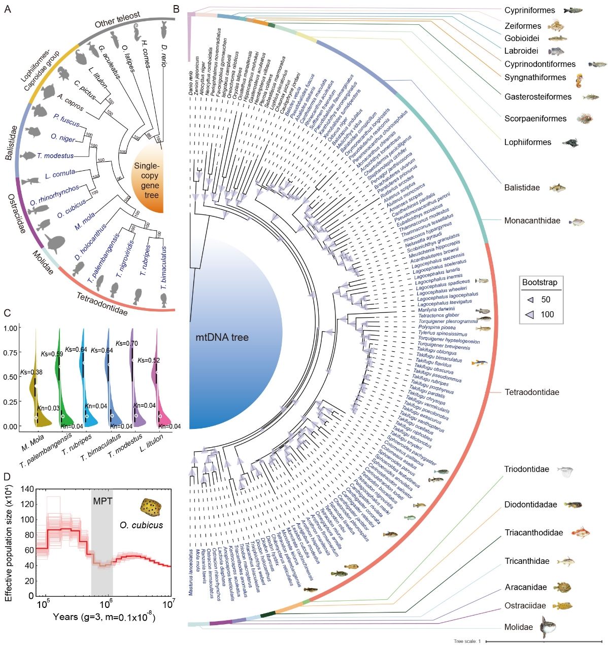 本研究构建了一个更加连续的染色体级别粒突箱鲀基因组图谱。粒突箱鲀拥有鲀形目中最大的基因组,这主要归因于转座元件的扩增。基于19个鱼类全基因组和131个物种线粒体基因组的系统发育关系支持将鲀形目分为三个主要姊妹群(箱鲀科-翻车鲀科Molidae、四齿鲀科Tetraodontidae、鳞鲀科Balistidae-单角鲀科Monacanthidae)。