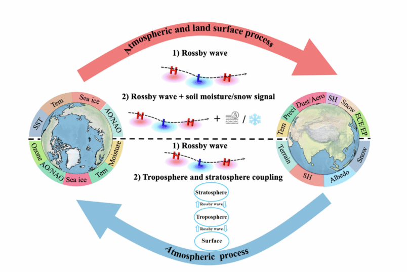 这是三者中最为活跃和直接的通道。源自北极巴伦支-喀拉海等关键区域的海冰融化,如同投石入水,在大气中激发出沿欧亚大陆传播的罗斯贝波波列,进而影响青藏高原的气温、降水和积雪。这一大气桥具有双向性:青藏高原的地表热力状况和积雪变化也能通过大气环流反馈,影响北极海冰和环流模式,甚至通过平流层过程调控北极的极涡。
