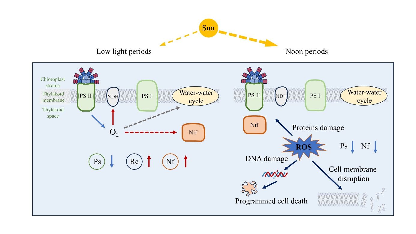 图2. 束毛藻 (Trichodesmium erythraeum IMS 101) 在磷限制条件下的光生理学过程。红色箭头表示正效应,蓝色箭头表示负效应。Ps,净光合作用;Re,呼吸作用;Nf,固氮作用;Nif,固氮酶;ROS,活性氧。在较低紫外辐射下,束毛藻固氮作用因光合放氧受抑制而被促进;在高阳光紫外辐射下,DNA与蛋白质受损及ROS的积累,导致碳氮代谢过程受阻及细胞死亡。