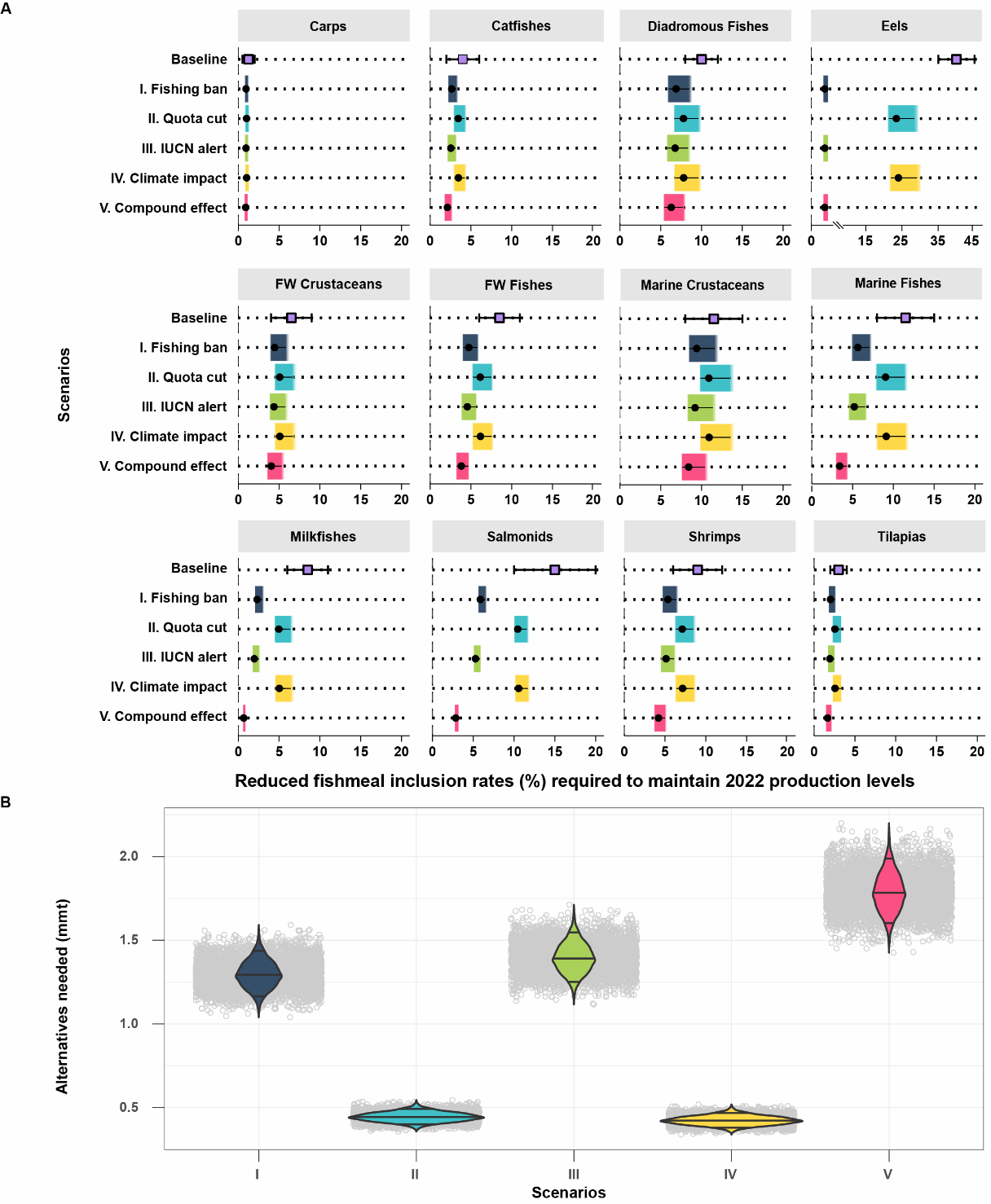 图3. 维持2022年(基准)养殖产量所需的鱼粉削减与替代规模量化(A)主要养殖类群配方中鱼粉添加率的削减幅度;(B)各情景下为减少并替代鱼粉所需的年替代原料量