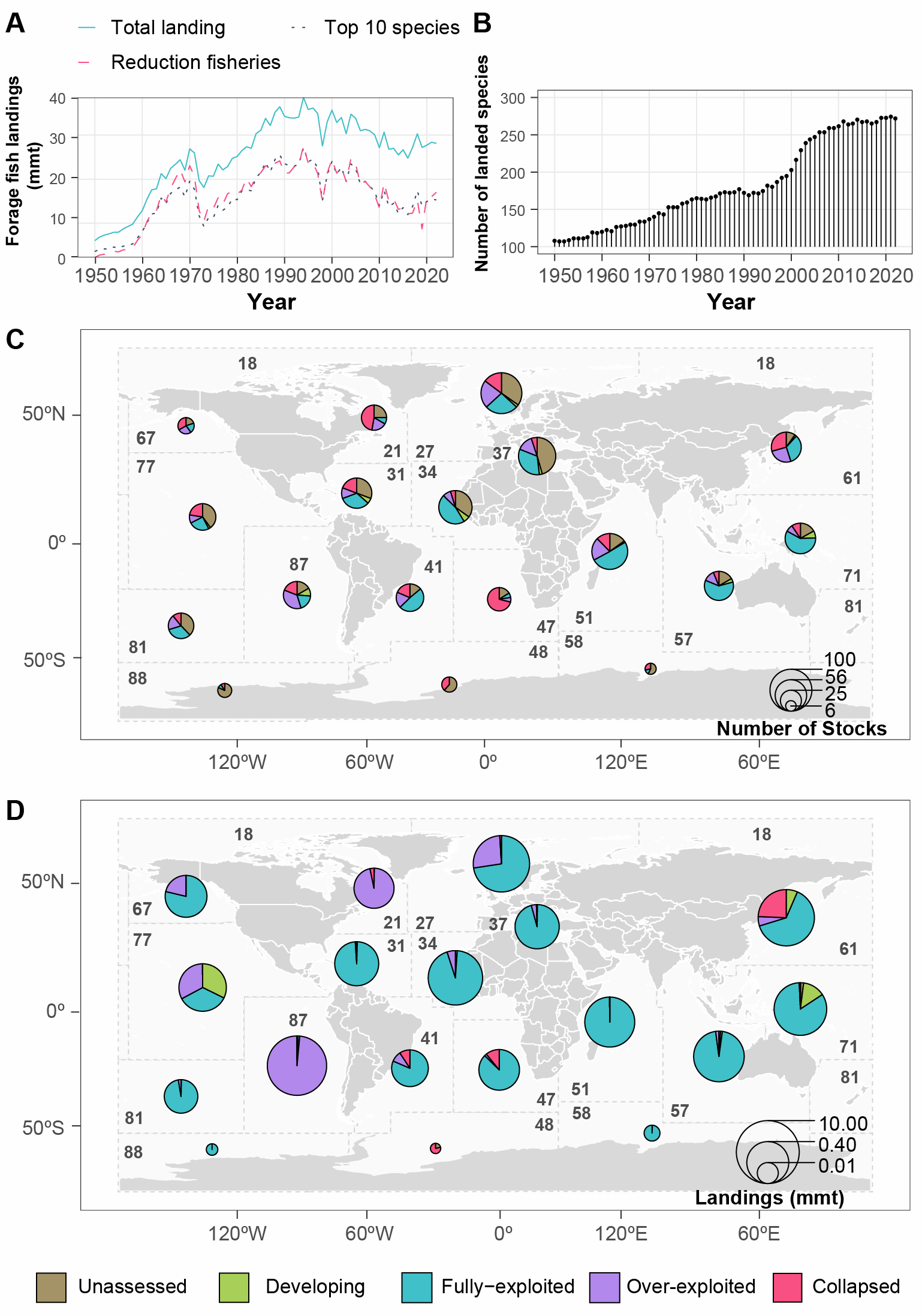 图1. 全球野生小型中上层鱼类资源的开发状况 (A) 1950年以来按活体重量计的历史捕捞量(百万吨, mmt)及加工为鱼粉的比例;(B)有捕捞记录的小型中上层鱼类物种数量;(C) 按种群数量计算的资源状态占比;(D) 按捕捞量计算的资源状态占比(基于FAO主要渔区,资源状态为近十年的平均值)