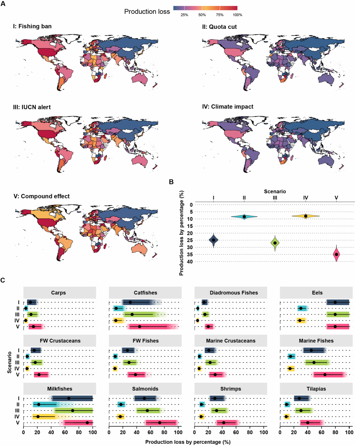 图2. 不同饵料鱼供应情景下相较2022年的预计养殖产量损失比例(A)按国家/地区分布;(B)各情景的总体下降幅度;(C)按主要养殖类群划分