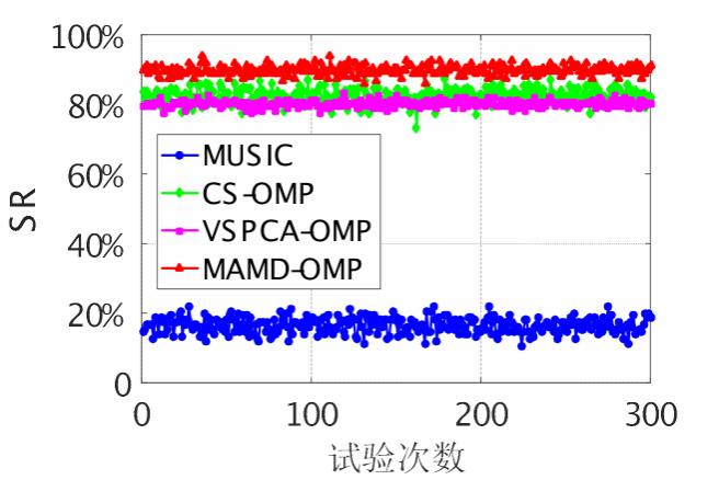 图4 不同方法水下DOA估计湖试结果对比(RMSE为均方根误差,SR为定位成功率, MAMD-OMP为该文所提方法)