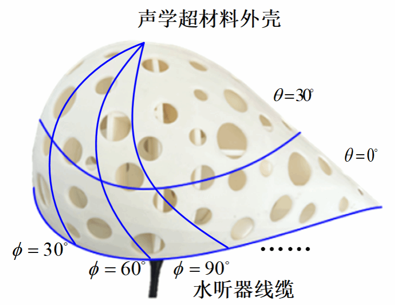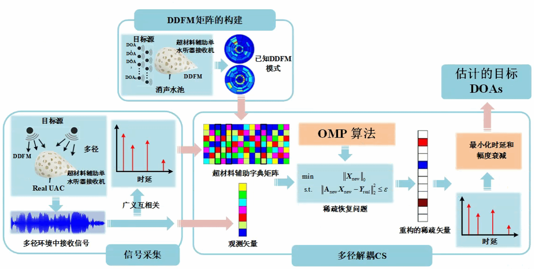 针对这一问题,研究团队深入分析水声传播特性调控物理机制及多径干扰对其造成的影响,设计并研制了一种“泪滴形”水声超材料外壳(如图1所示)。该外壳在低流阻外形下,通过内部随机化设置多孔腔结构增强亥姆霍兹谐振器声学调控性能,对入射声波施加“方向相关”传输特性调控效应;并进一步利用超材料调控特性构建方向相关频率调制(DDFF)矩阵,设计超材料辅助稀疏恢复解耦算法,分离信道多径时延和随机幅度对DOA估计造成的干扰(如图2所示),从而借助该超材料利用单个标量水听器实现水下多径环境下目标DOA估计。