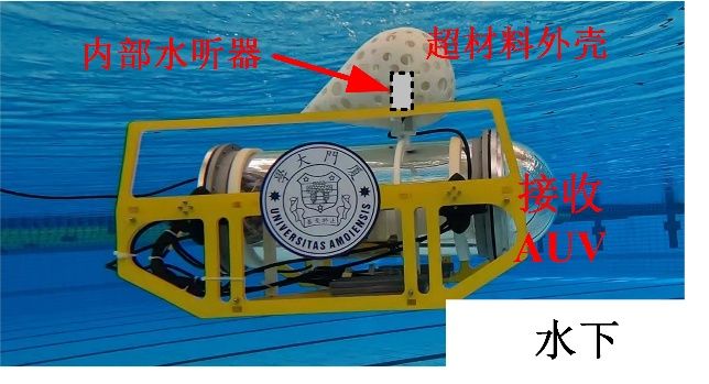 (b) 湖试试验AUV及水下声源 (c) 配备超材料外壳AUV水下姿态