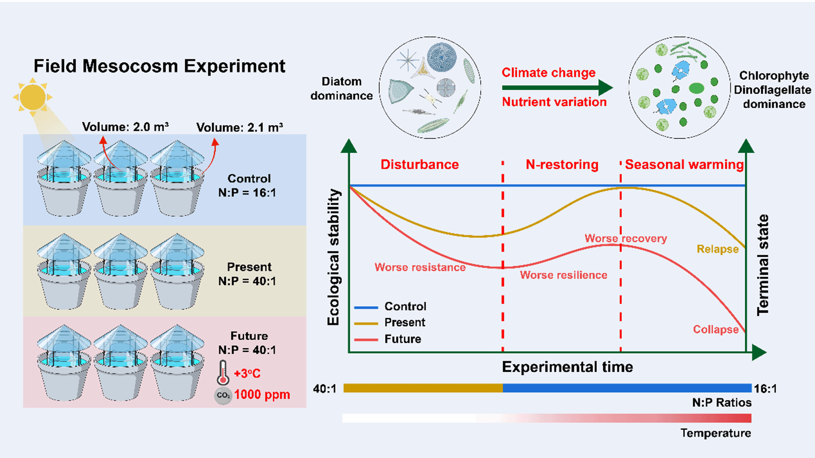针对上述问题,研究团队在中国东山湾的亚热带近海水域开展了为期32 天的中尺度围隔实验(2000 L),设置了对照组(N:P比16:1),当天情景组(NP比40:1)和未来情景组(N:P比40:1+暖化酸化),通过整合分析不同组别叶绿素 a(chl a) 含量、初级生产力、浮游生物群落结构、细菌丰度、摄食率及颗粒有机物化学计量特征的高频监测数据,验证了以下核心假说:未来升温(温度升高3℃)与酸化(pH降低0.4个单位)会放大浮游植物群落对氮磷比升高的响应强度,同时削弱其生态系统稳定性,进而增加生态修复的难度。
