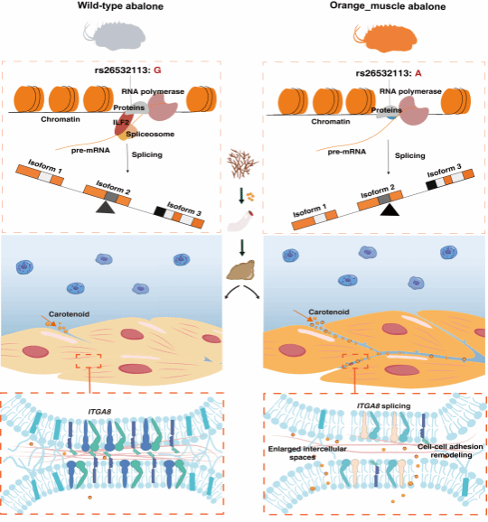 该研究以橙肌西氏鲍(Haliotis gigantea)为模型,整合染色体水平的基因组组装、全基因组关联分析(GWAS)、多组学联合分析、透射电子显微镜观察及功能验证等多种技术手段,首次系统揭示了非编码区单核苷酸多态性(SNP)通过调控基因剪接过程,进而驱动类胡萝卜素积累与肌肉着色的完整形成路径。该成果为解析生物性状“基因型—表型”间的复杂关系提供了全新的理论视角,并对贝类色泽性状的遗传改良具有重要指导意义。