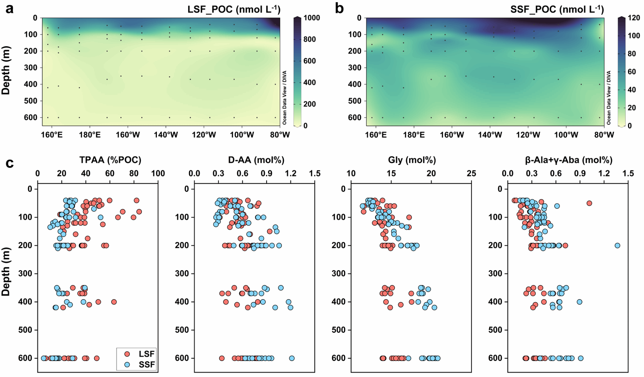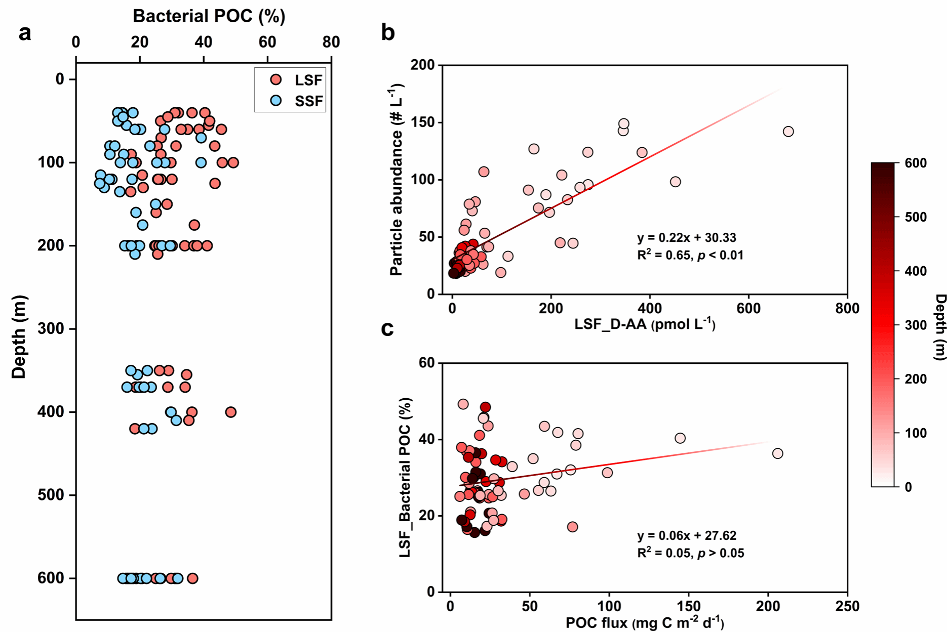 基于D-氨基酸分子标志物定量结果,发现细菌来源碳在POC中占比显著:大颗粒中约为30%,小颗粒中约为20%。这一比例远高于传统基于细胞丰度估算的结果(<5%),表明细菌碎屑有机质是POC的重要组成部分。