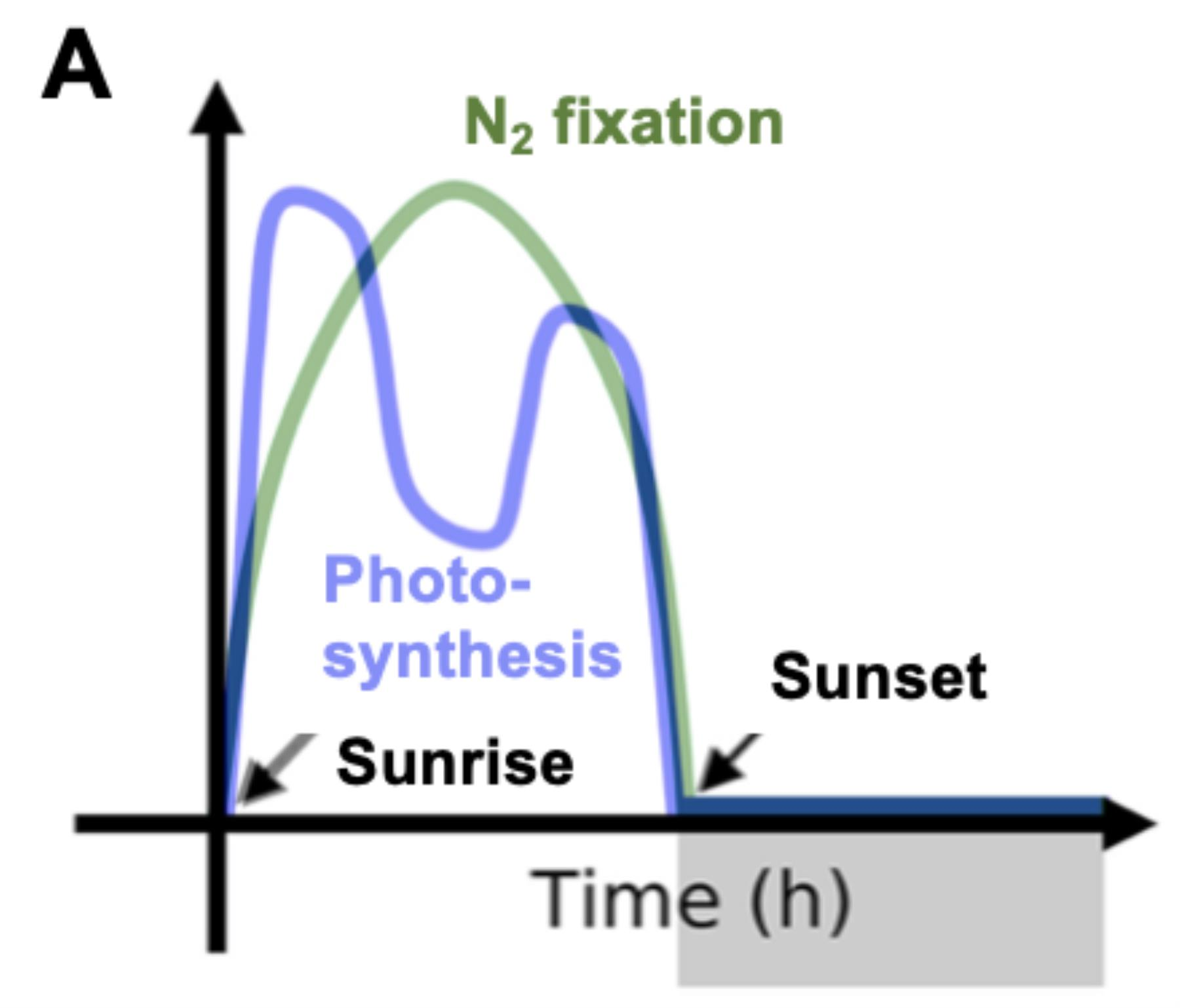 针对这个问题,学者们主要提出时间错峰和空间隔离两种假说。时间错峰假说提出,光合和固氮作用在日周期中达到峰值的时间不同(图1A),可能有利于在固氮时维持低胞内氧气浓度。然而,大量观测数据显示,在固氮峰值期仍有较高水平的光合作用和氧气产生速率。那么,仅通过光合和固氮作用的错峰,束毛藻是否足以解决光合产氧和固氮之间的矛盾呢?部分主流科学家基于免疫荧光法的证据,提出空间隔离的假说,即在束毛藻藻丝或者束状体中,各段细胞分别进行光合和固氮作用,从而形成二者空间上的隔离(图1B)。然而,近年来通过更先进的研究方法(如NanoSIMS),学者并未在束毛藻中发现光合和固氮作用的空间隔离现象。那么,束毛藻光合和固氮作用的空间隔离,是否必须存在呢?
