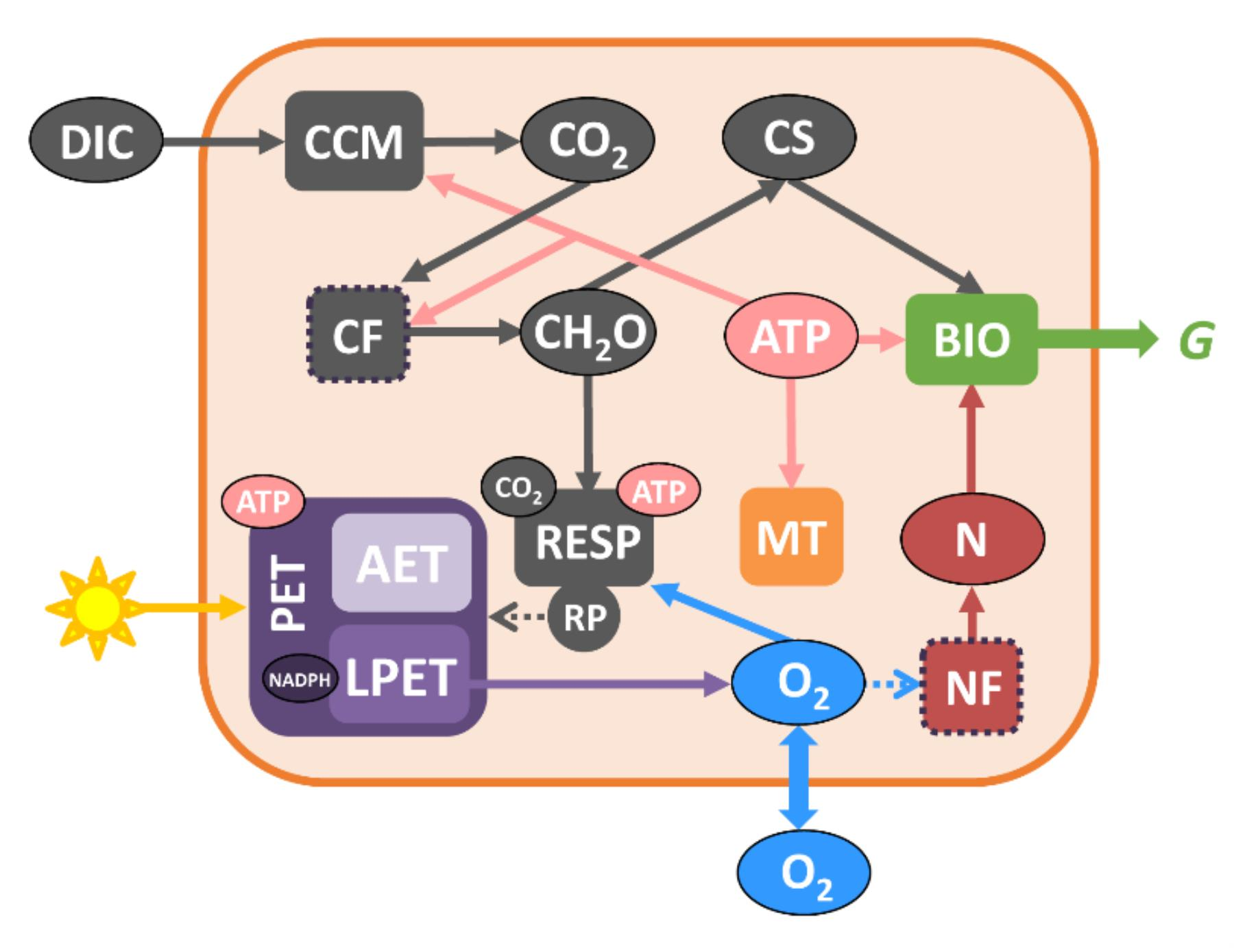 本研究通过构建束毛藻细胞生态生理模型(图2),模拟了其进行光合和固氮作用的主要过程、细胞内氧气的产生和消耗、胞内外氧气的交换、以及细胞内能量的产生和分配,较好地还原了历史实验室数据中束毛藻光合和固氮速率的日间变化特征,进一步提出束毛藻不依赖于空间隔离的光合和固氮作用的共存机制(图3):