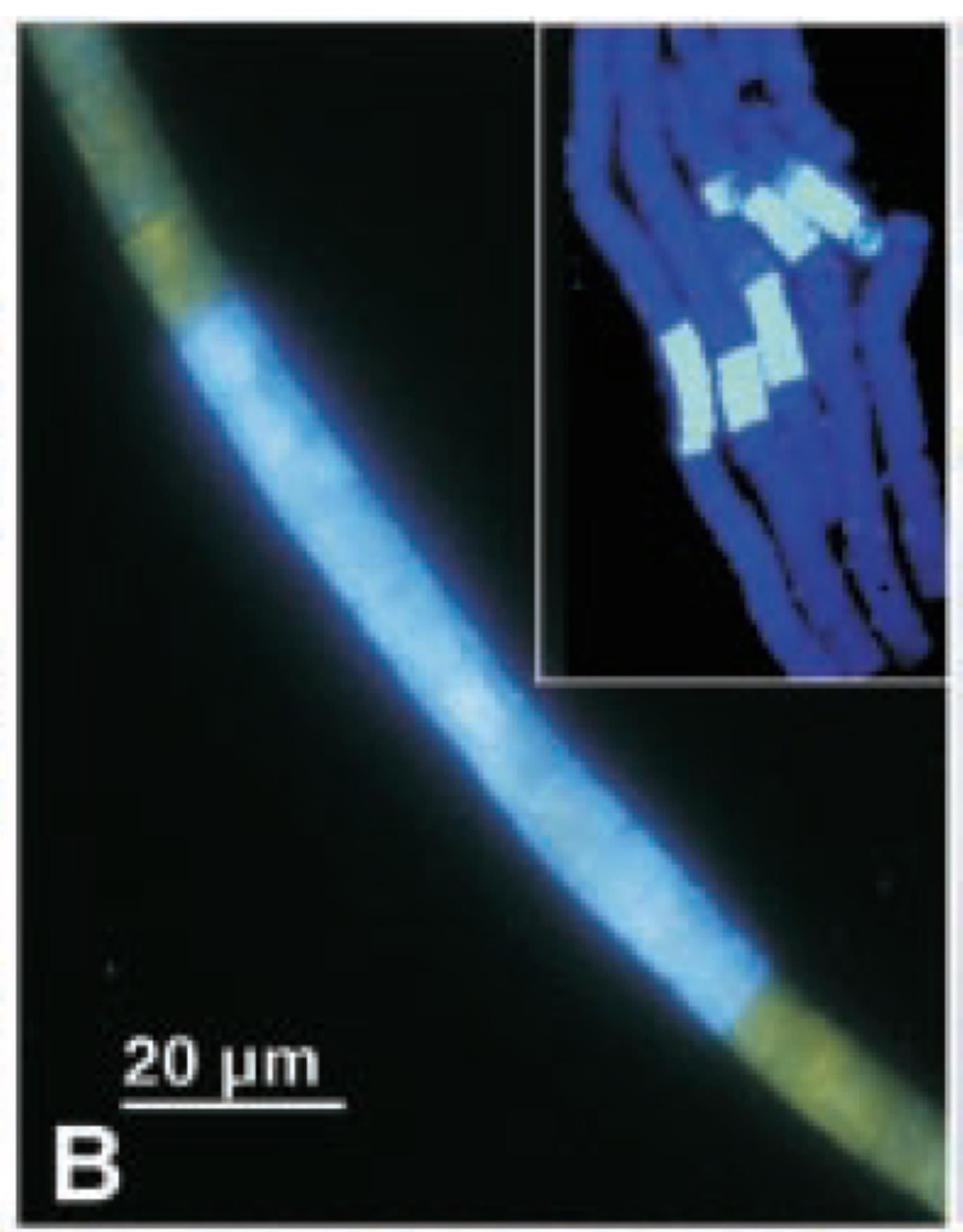 图1. (A)束毛藻光合和固氮速率日间变化示意图(改自Inomura et al. 2019, mSystems);(B)免疫荧光法显示束毛藻固氮酶集中分布于一段细胞(来自Berman-Frank et al. 2001, Science)